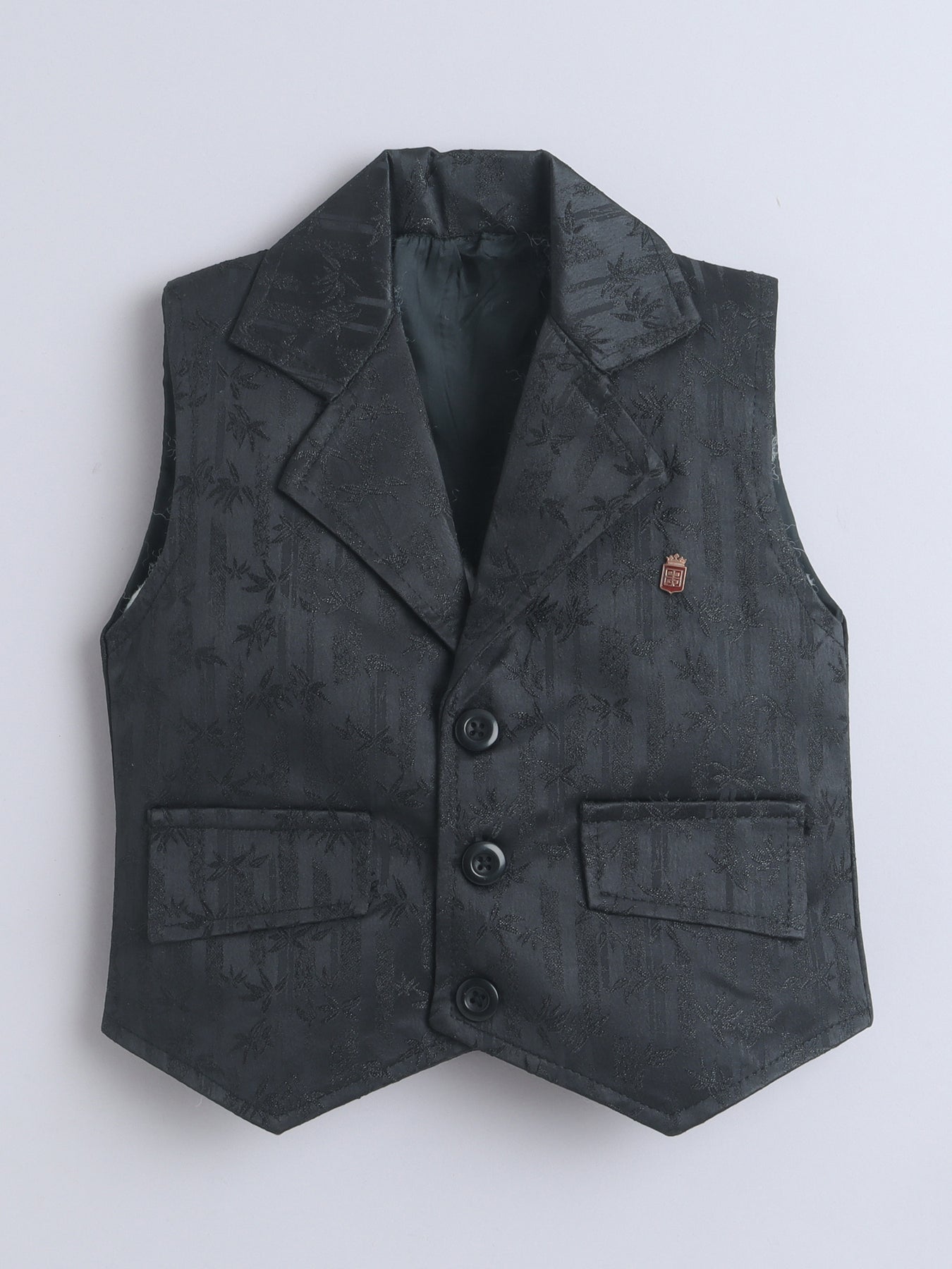 Dress your little one in timeless elegance with this 4-Piece Suit Set. Crafted from premium soft fabric, this outfit showcases an intricate leaf motif pattern that adds a touch of richness and sophistication. The set includes a stylish waistcoat with detailed woven design and button closure, a matching pair of trousers, and a crisp solid shirt that complements the ensemble perfectly. A pre-tied adjustable bow tie completes the look, giving your boy a sharp and graceful appearance. Ideal for weddings, festive occasions, parties, and family celebrations, this suit set offers both comfort and class. The soft inner lining and breathable fabric ensure ease of wear, while the elegant jacquard texture adds a royal charm, making it an excellent choice for special events where your young gentleman needs to stand out in style.