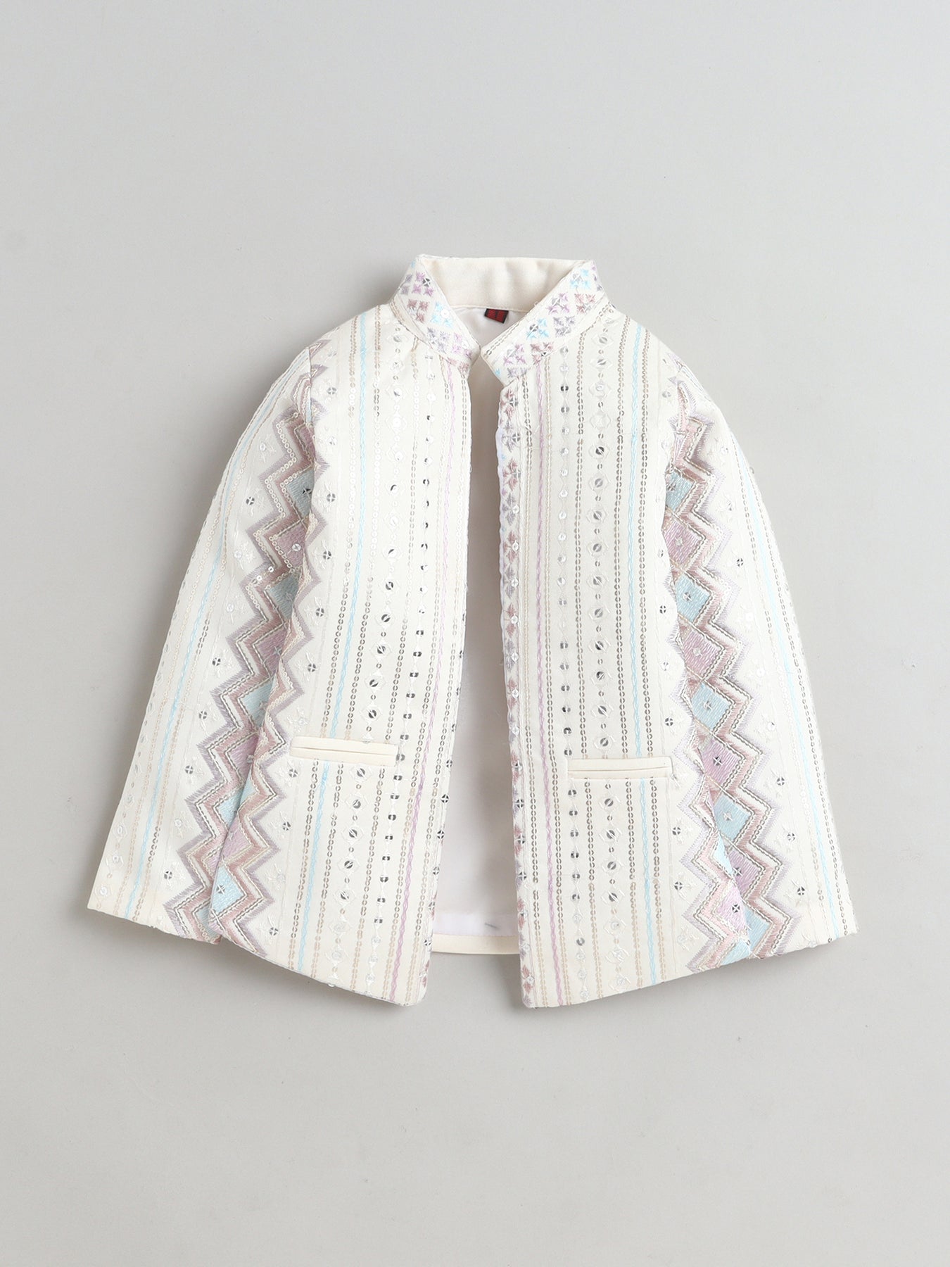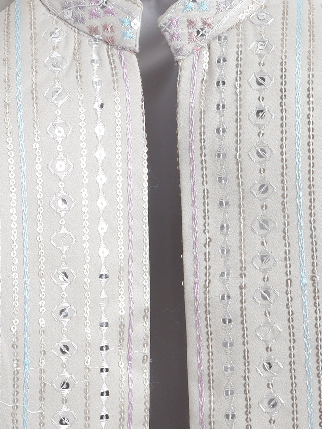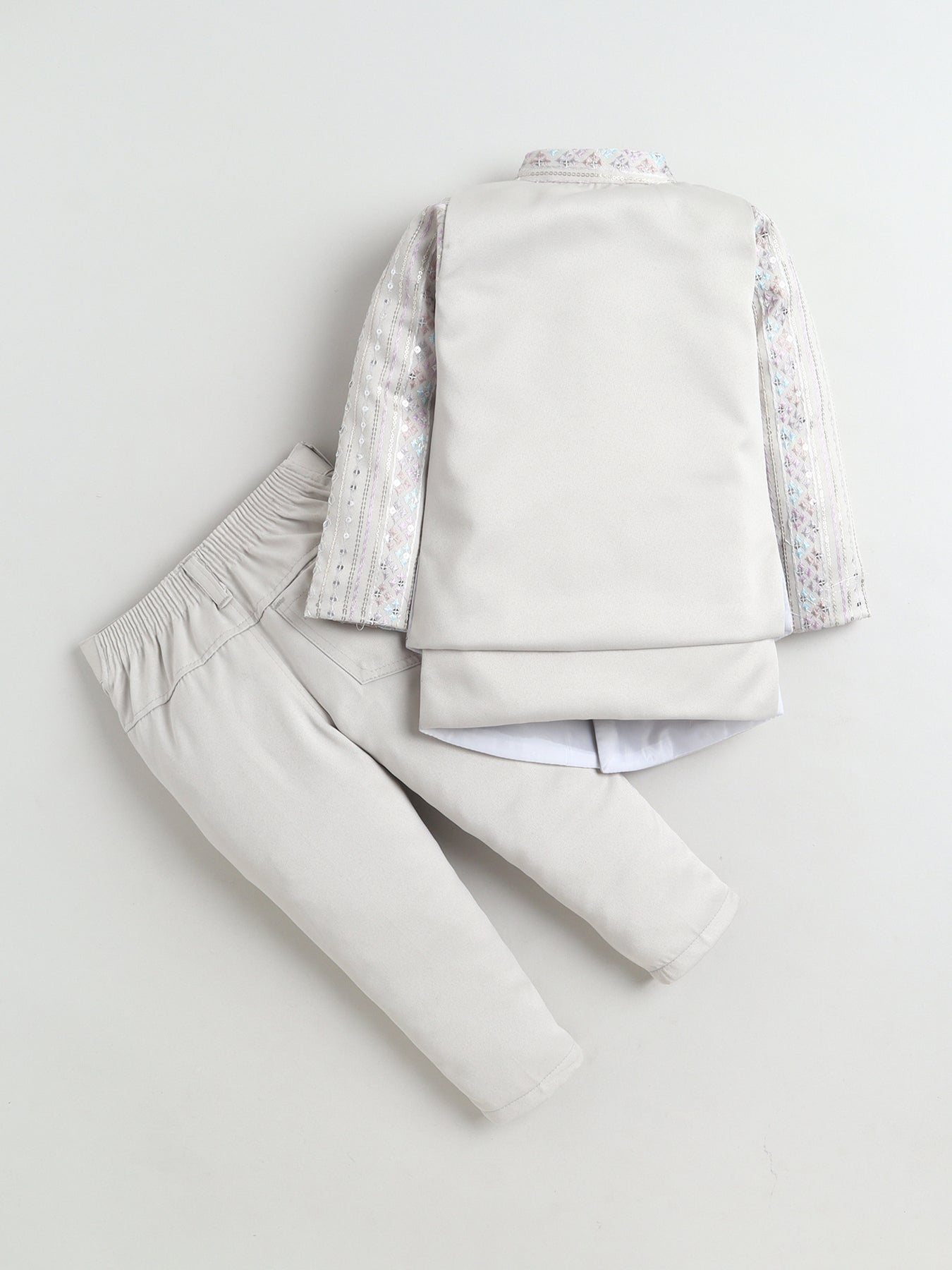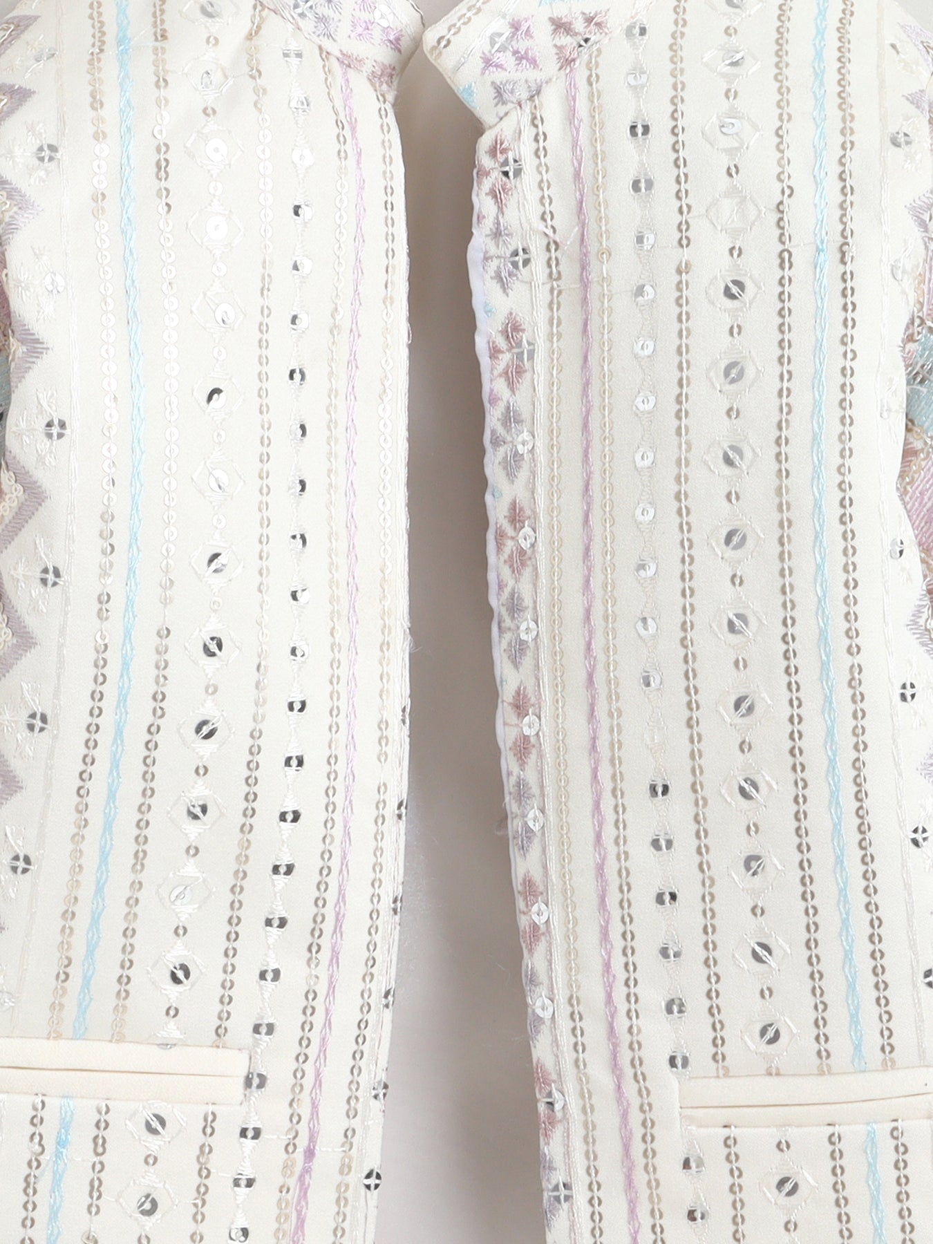 Make festive moments extra special with this thoughtfully crafted sherwani set, designed to reflect timeless ethnic charm with a modern touch. The shrug showcases an elegant zigzag embroidered pattern, beautifully enhanced with delicate sequin accents that add a subtle festive shimmer without overpowering the look. A matching sleeveless sherwani layers the outfit with added depth and sophistication, creating a refined and celebratory silhouette. Styled with a traditional mandarin collar, straight hem and practical side slits, the sherwani is finished in an above-knee length that allows ease of movement and all-day comfort. Paired seamlessly with coordinating trousers, this ensemble is ideal for weddings, festive celebrations, cultural events and special occasions, offering a perfect balance of comfort, craftsmanship and contemporary ethnic style.