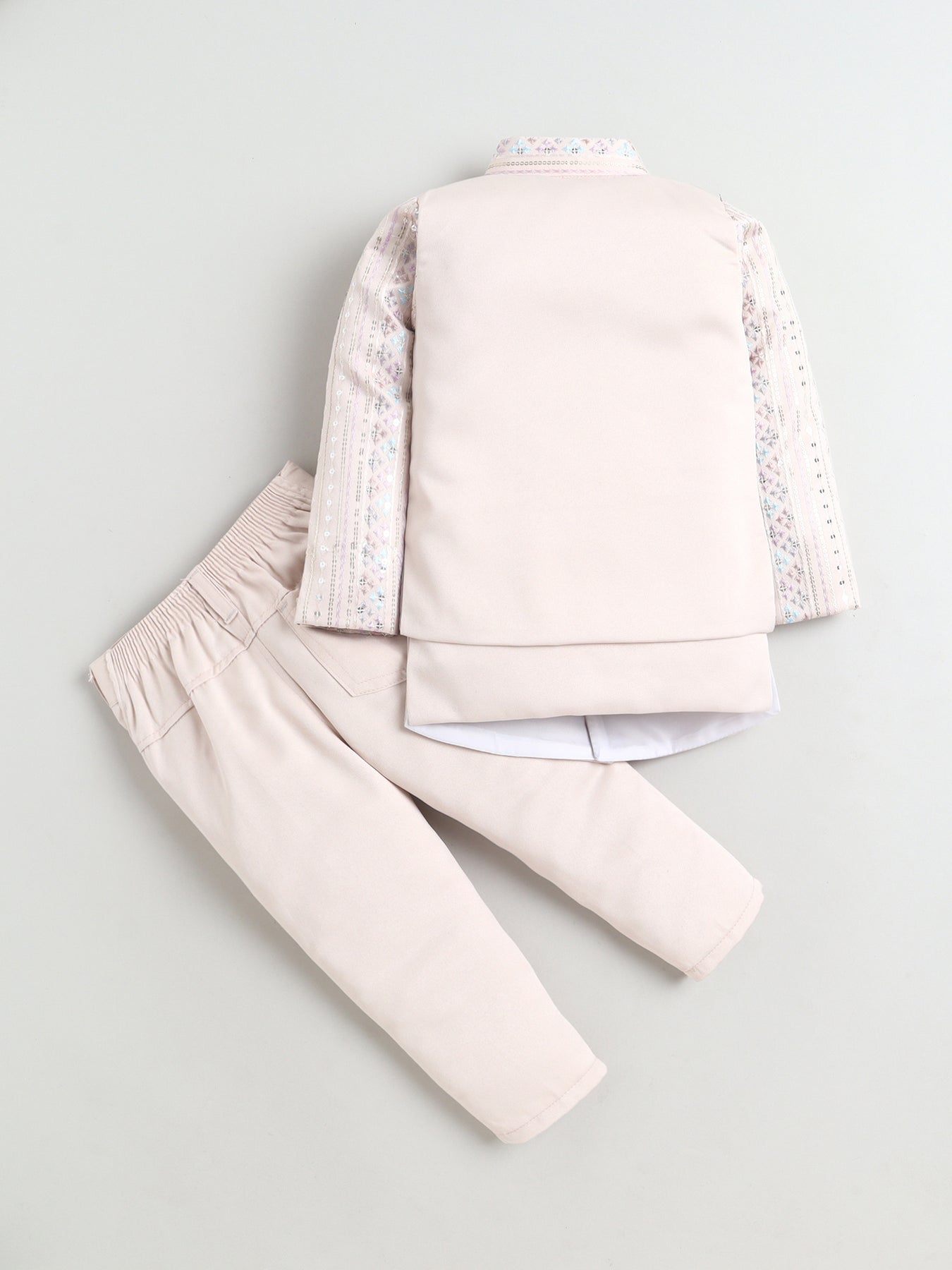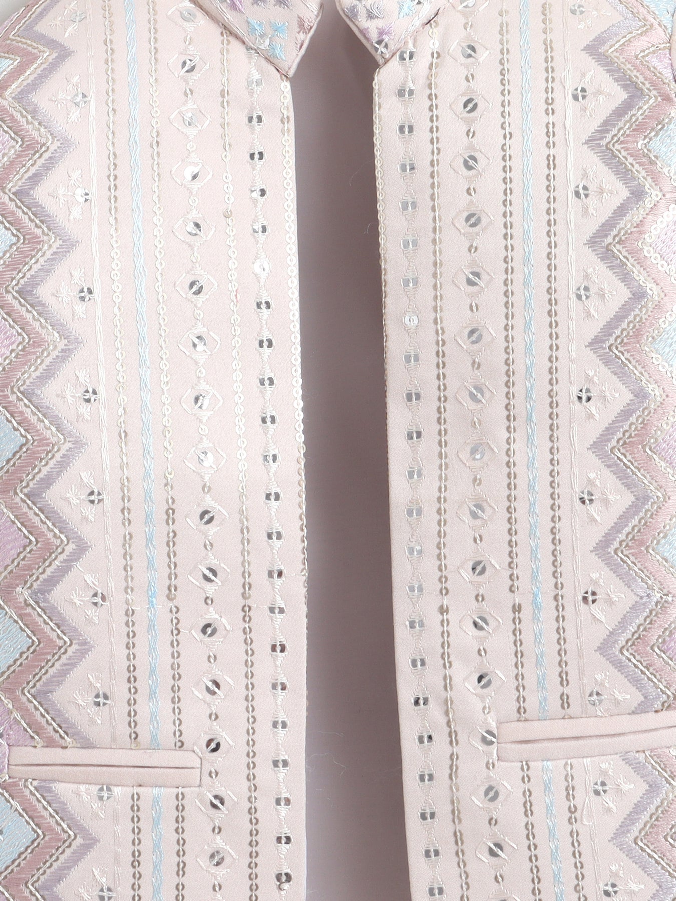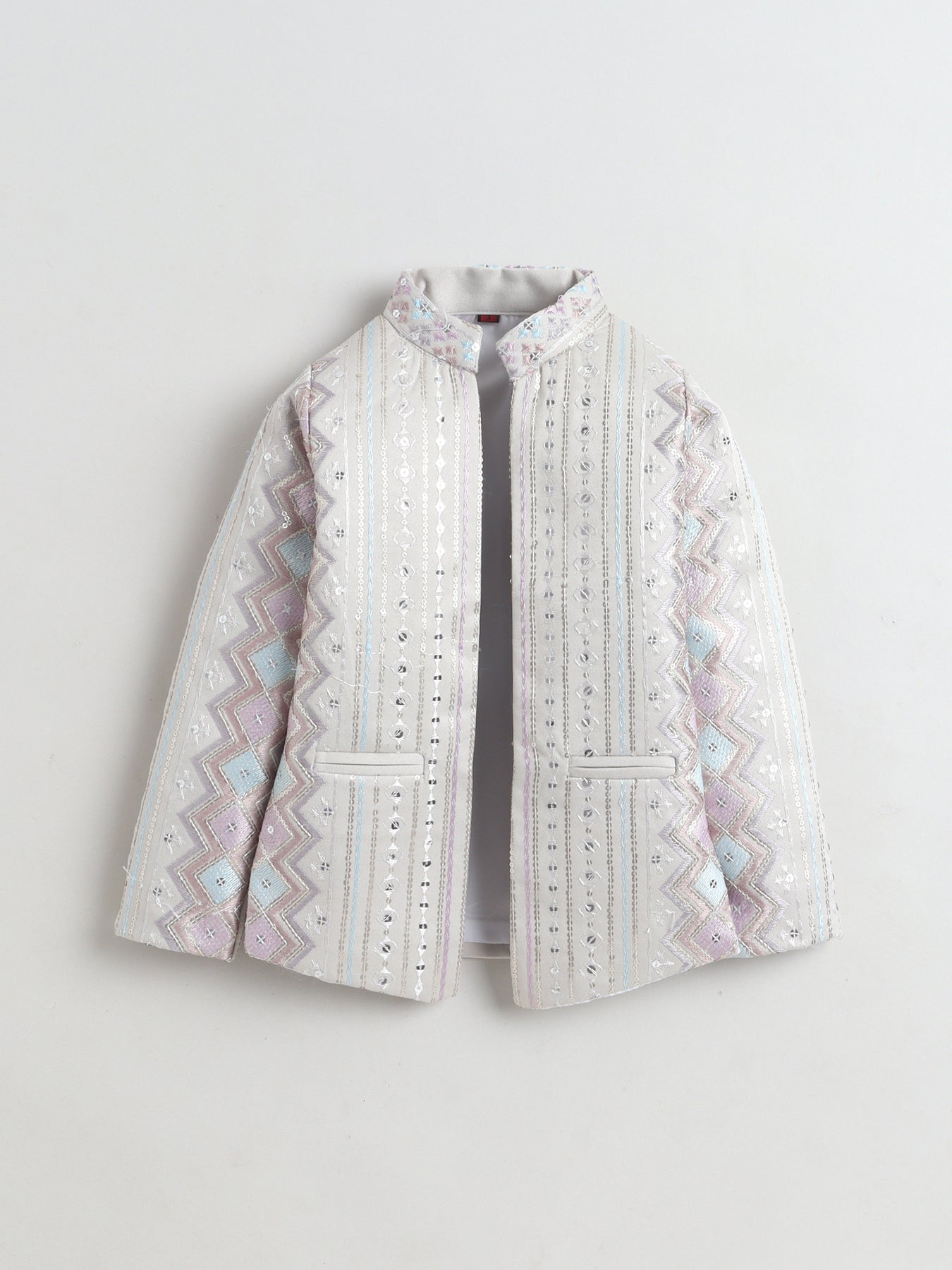 Make festive moments extra special with this thoughtfully crafted sherwani set, designed to reflect timeless ethnic charm with a modern touch. The shrug showcases an elegant zigzag embroidered pattern, beautifully enhanced with delicate sequin accents that add a subtle festive shimmer without overpowering the look. A matching sleeveless sherwani layers the outfit with added depth and sophistication, creating a refined and celebratory silhouette. Styled with a traditional mandarin collar, straight hem and practical side slits, the sherwani is finished in an above-knee length that allows ease of movement and all-day comfort. Paired seamlessly with coordinating trousers, this ensemble is ideal for weddings, festive celebrations, cultural events and special occasions, offering a perfect balance of comfort, craftsmanship and contemporary ethnic style.