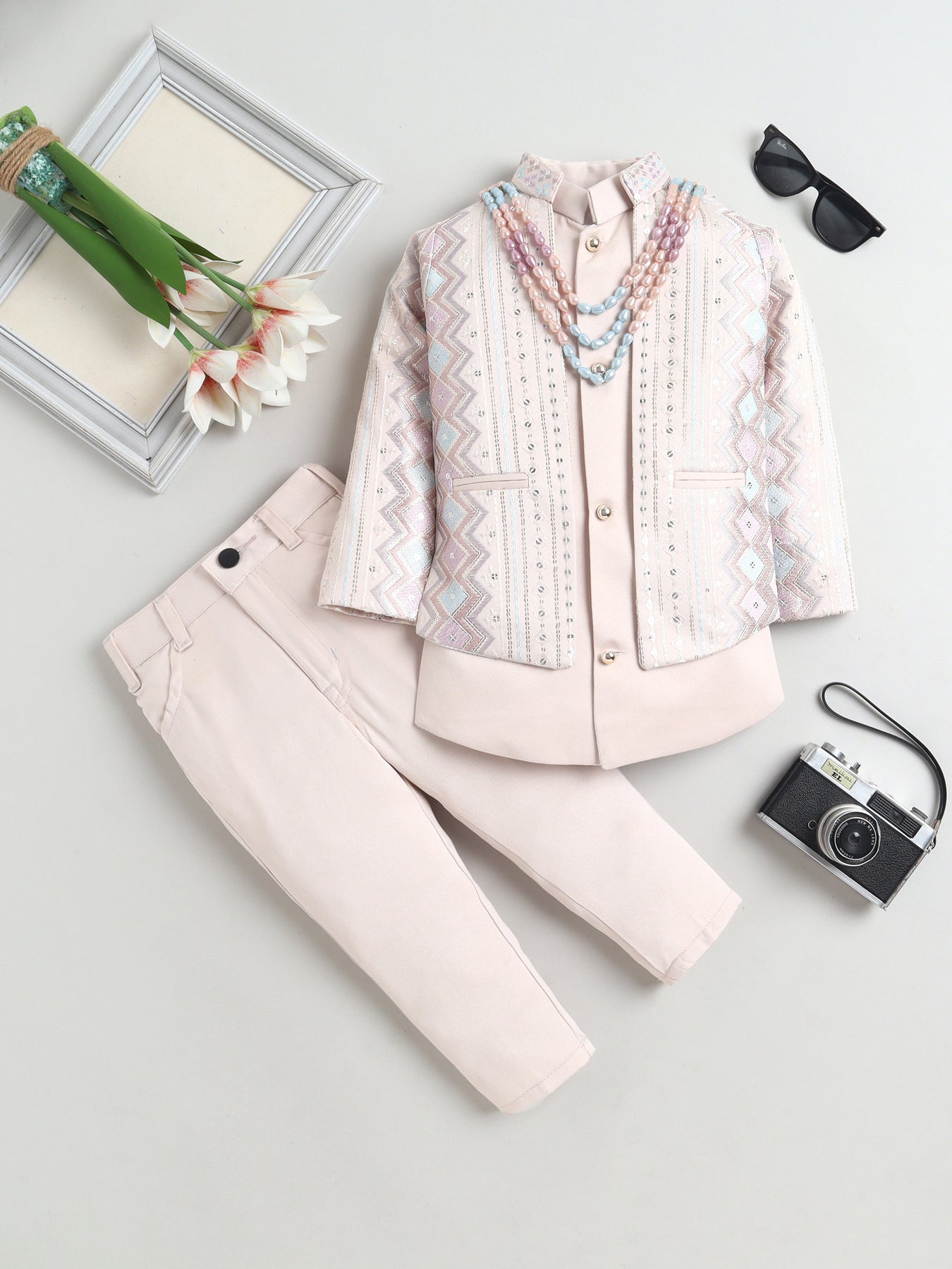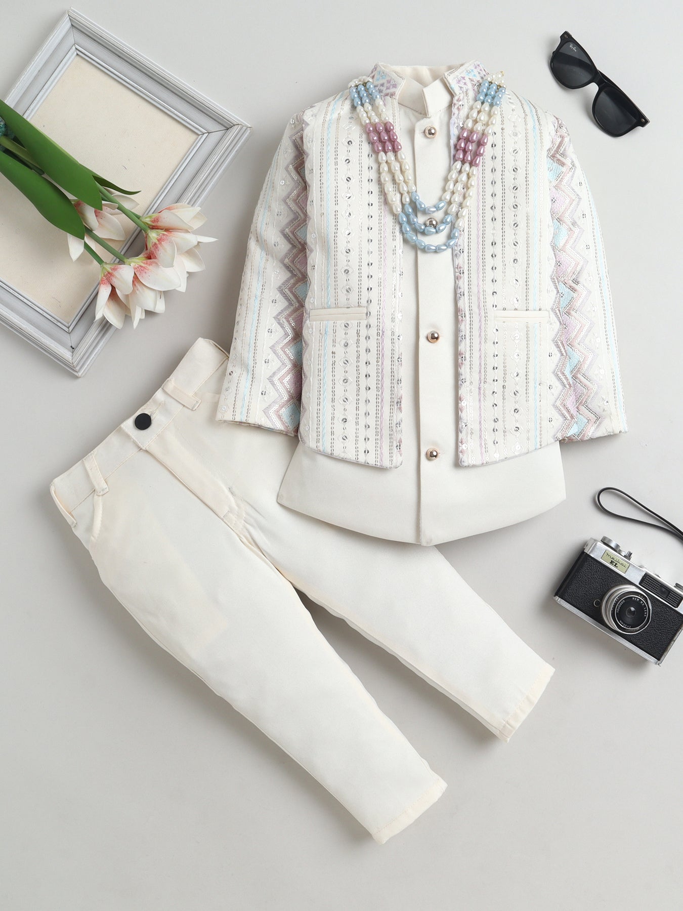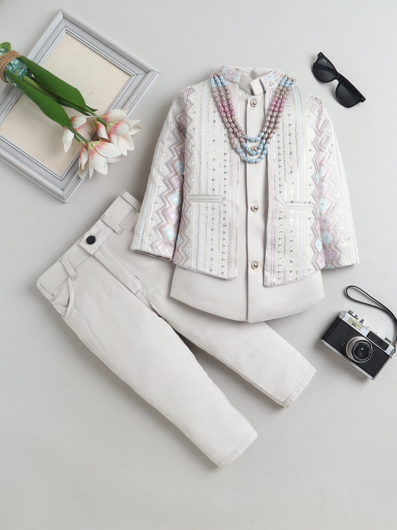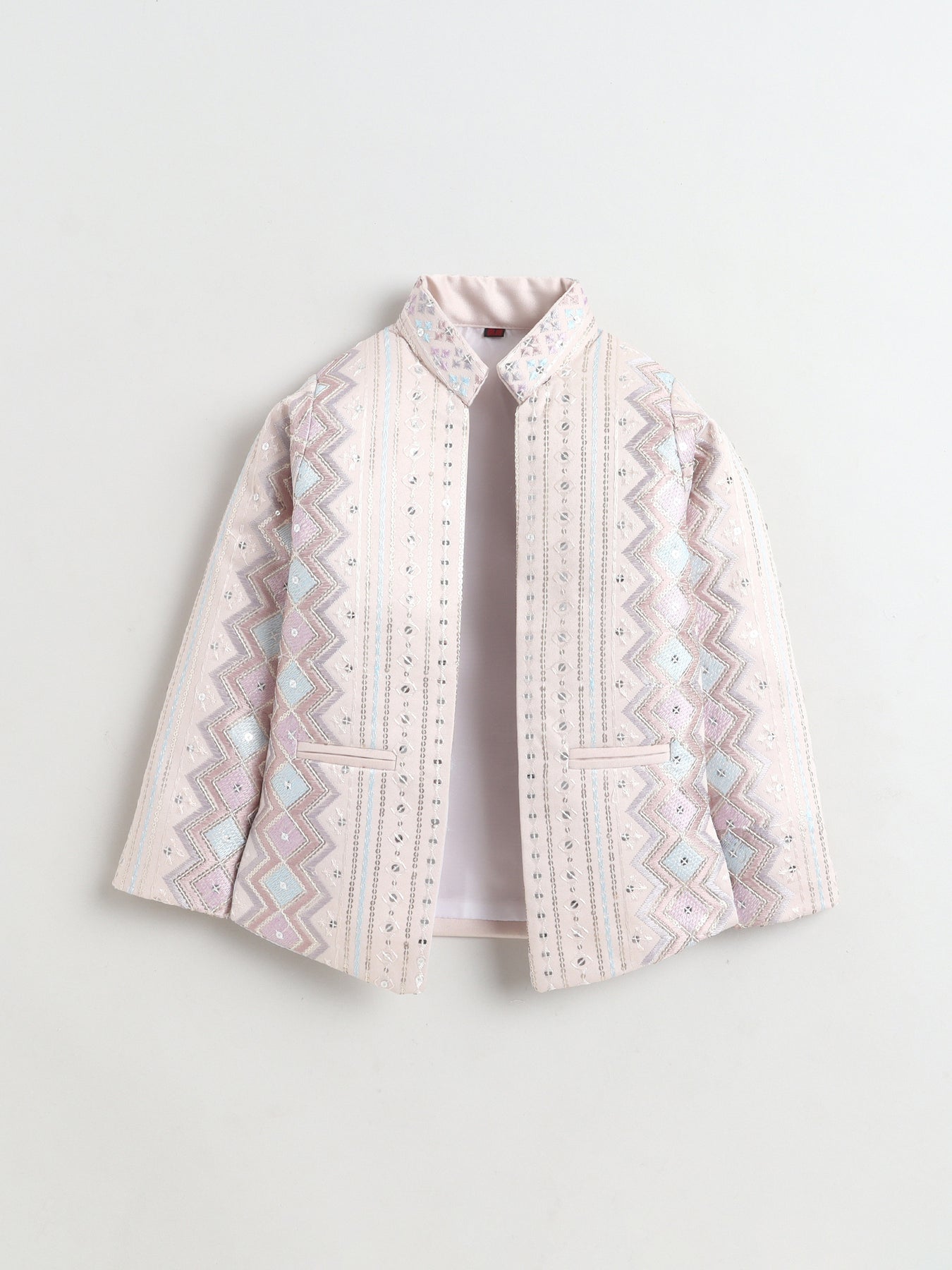 Make festive moments extra special with this thoughtfully crafted sherwani set, designed to reflect timeless ethnic charm with a modern touch. The shrug showcases an elegant zigzag embroidered pattern, beautifully enhanced with delicate sequin accents that add a subtle festive shimmer without overpowering the look. A matching sleeveless sherwani layers the outfit with added depth and sophistication, creating a refined and celebratory silhouette. Styled with a traditional mandarin collar, straight hem and practical side slits, the sherwani is finished in an above-knee length that allows ease of movement and all-day comfort. Paired seamlessly with coordinating trousers, this ensemble is ideal for weddings, festive celebrations, cultural events and special occasions, offering a perfect balance of comfort, craftsmanship and contemporary ethnic style.