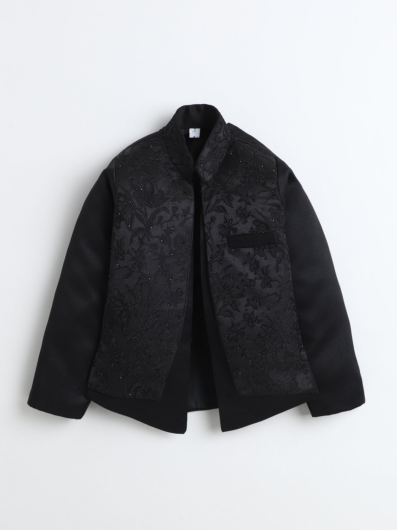 The inner sleeveless sherwani features a clean, solid finish that perfectly balances the embellished shrug while ensuring a structured and elegant silhouette.