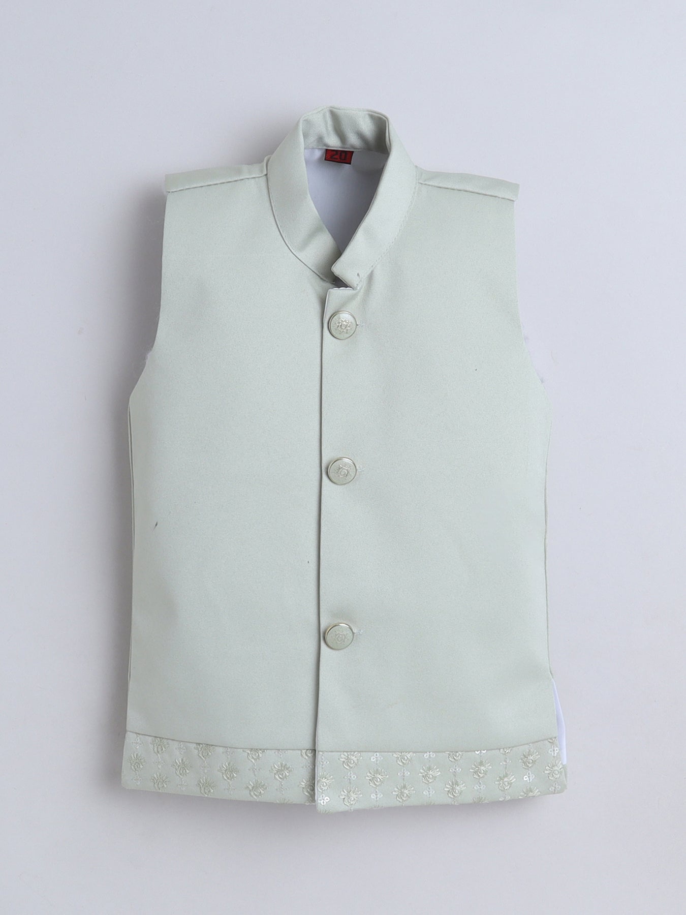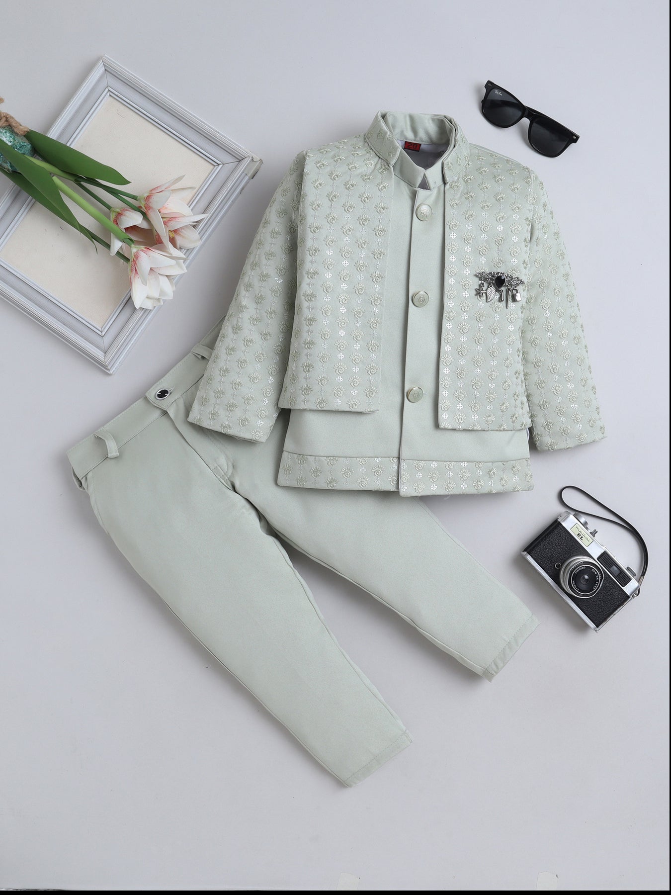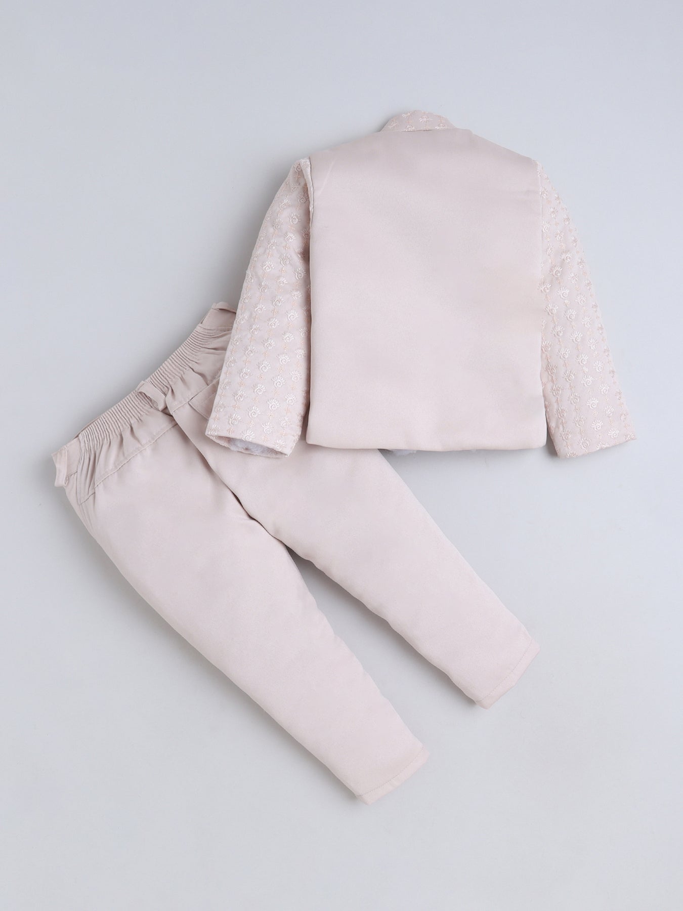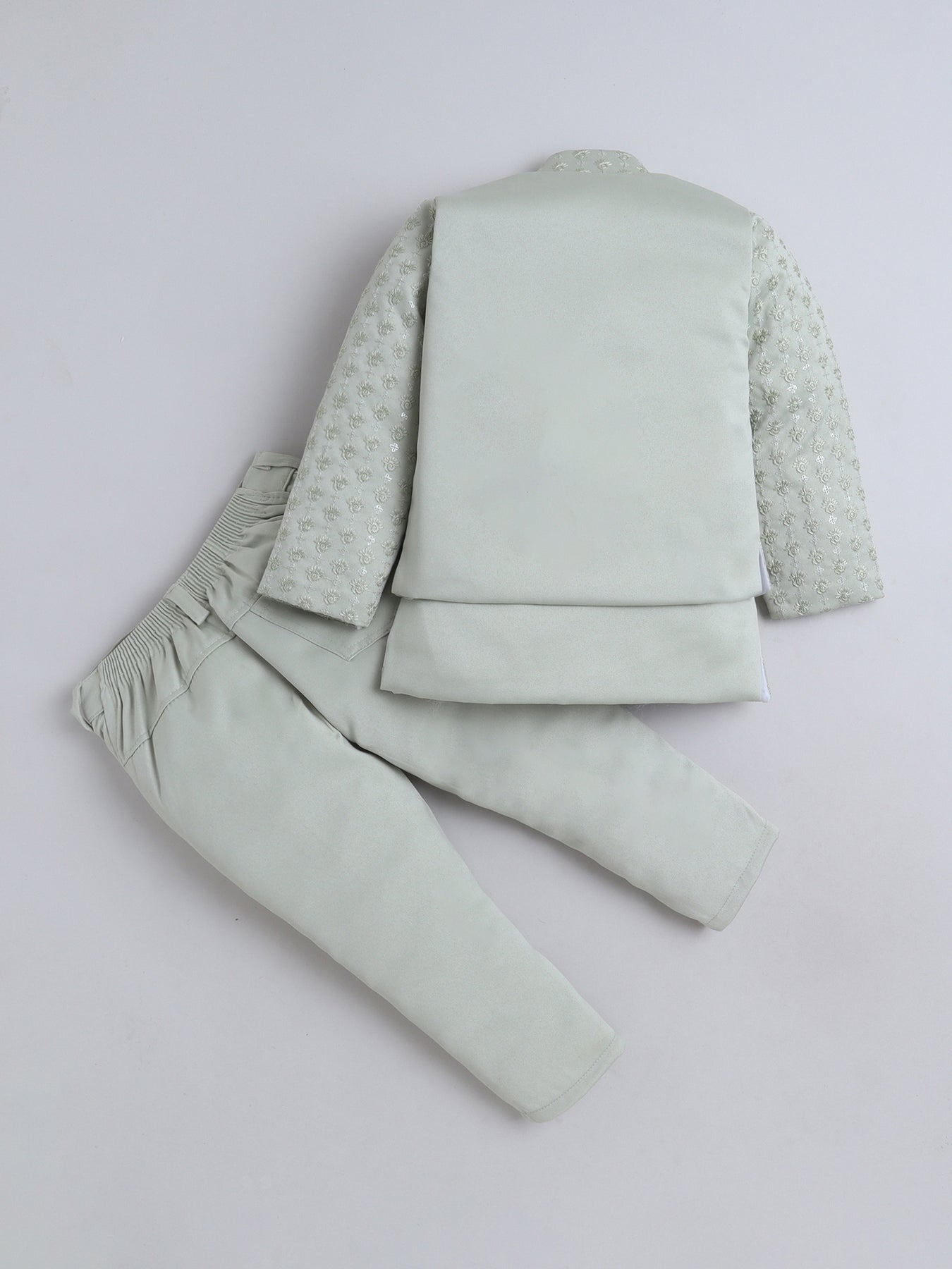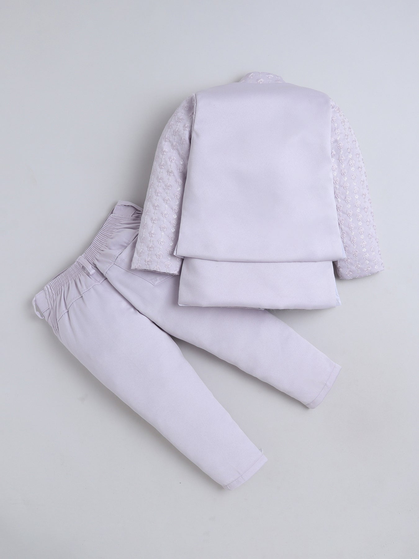 Give your little one a truly regal look with this stunning sherwani set, featuring a sequins-embellished and finely embroidered full-sleeve shrug that radiates festive elegance from every angle. The set includes a stylish sleeveless sherwani, designed with intricate detailing to add a princely layered effect, enhancing the overall richness of the ensemble. Paired with a well-tailored trouser that ensures comfort and ease of movement, this outfit blends traditional craftsmanship with contemporary charm. Crafted from premium-quality fabric, the sherwani set offers a soft feel, refined finish, and an opulent look, making it an ideal choice for weddings, receptions, festive celebrations, or any special event where your young boy needs to stand out with grace and sophistication.