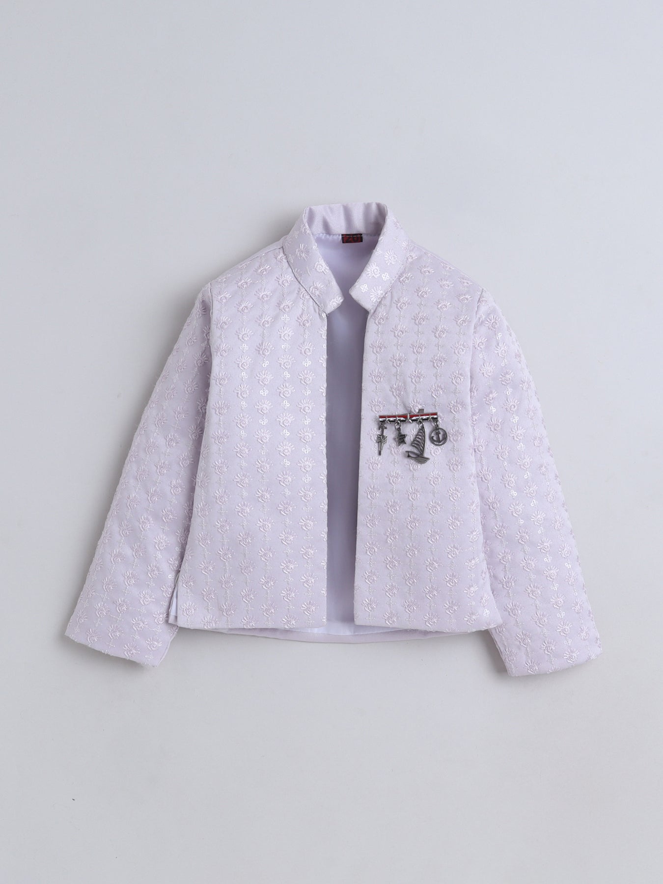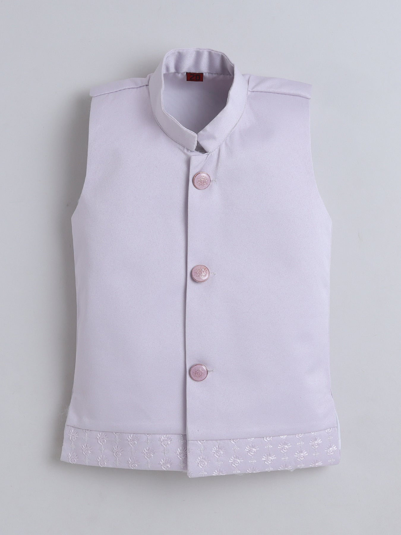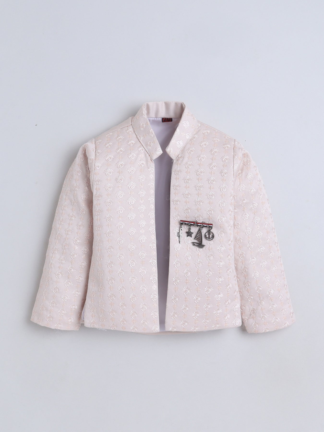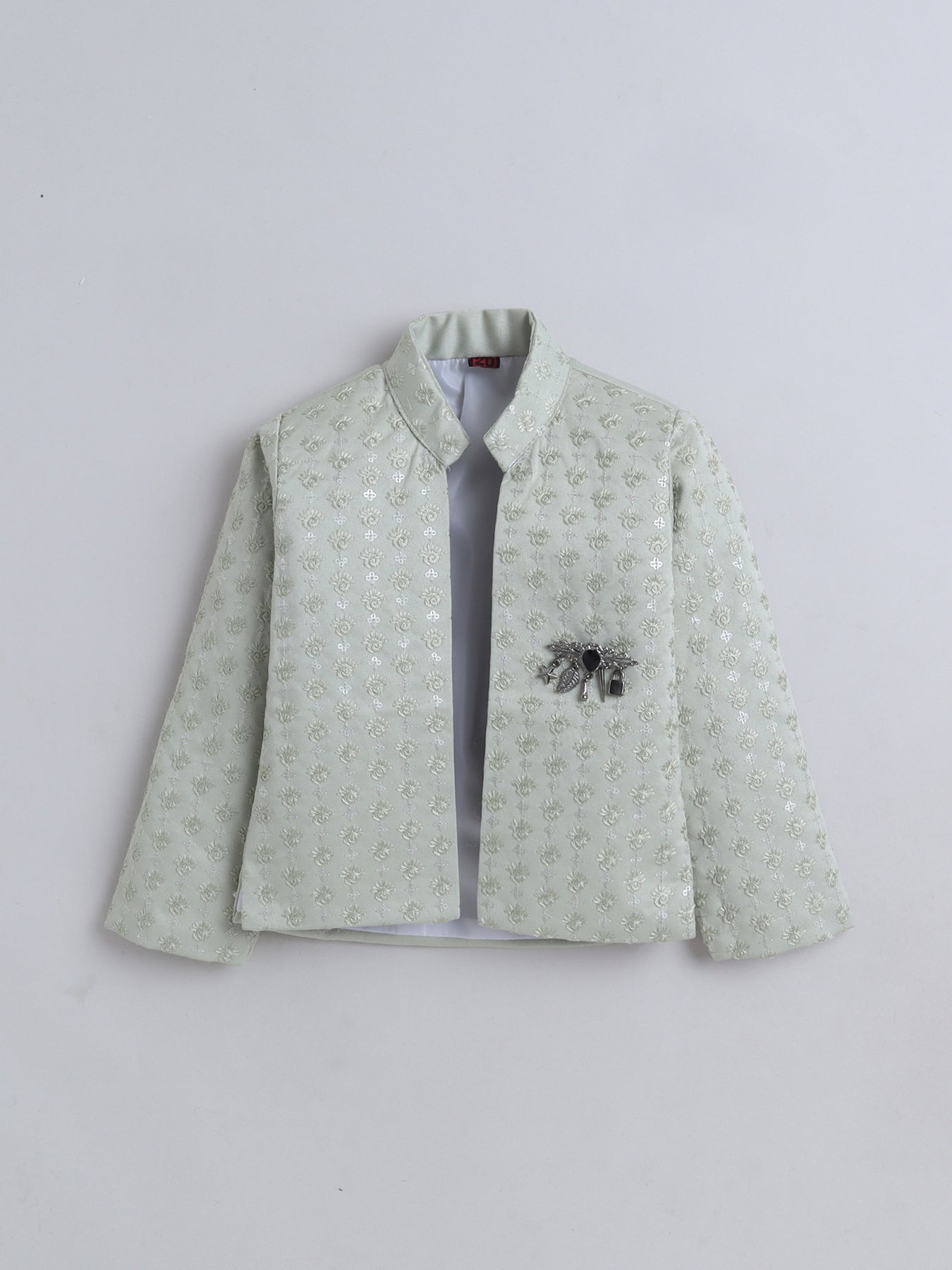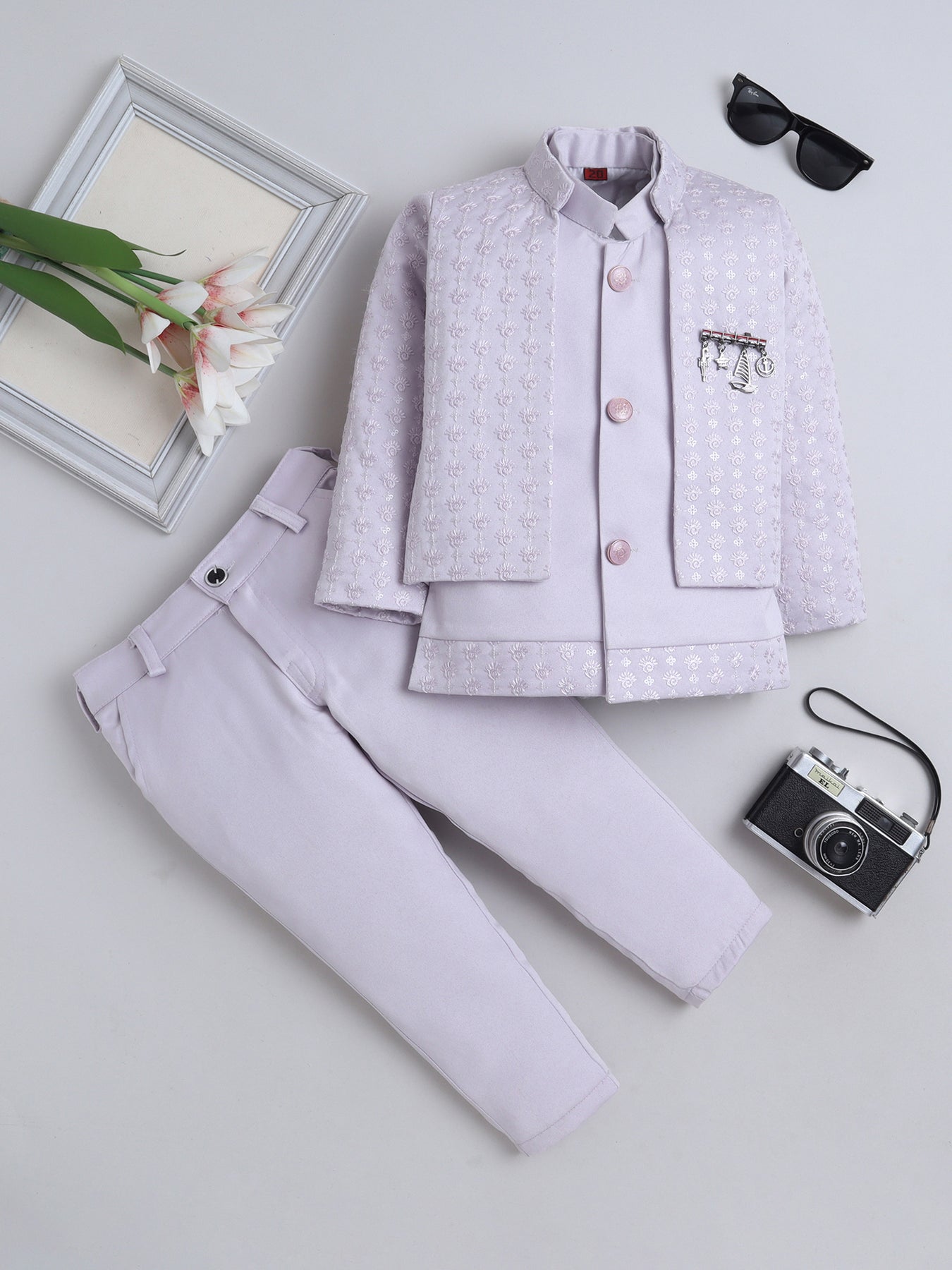 Give your little one a truly regal look with this stunning sherwani set, featuring a sequins-embellished and finely embroidered full-sleeve shrug that radiates festive elegance from every angle. The set includes a stylish sleeveless sherwani, designed with intricate detailing to add a princely layered effect, enhancing the overall richness of the ensemble. Paired with a well-tailored trouser that ensures comfort and ease of movement, this outfit blends traditional craftsmanship with contemporary charm. Crafted from premium-quality fabric, the sherwani set offers a soft feel, refined finish, and an opulent look, making it an ideal choice for weddings, receptions, festive celebrations, or any special event where your young boy needs to stand out with grace and sophistication.