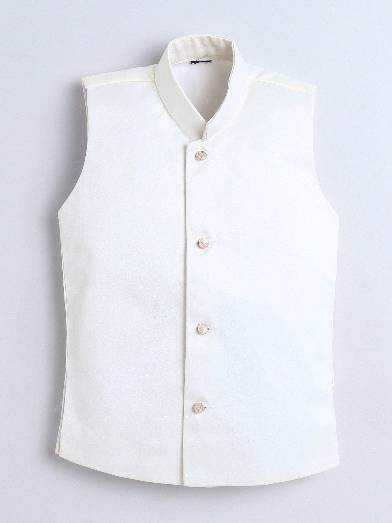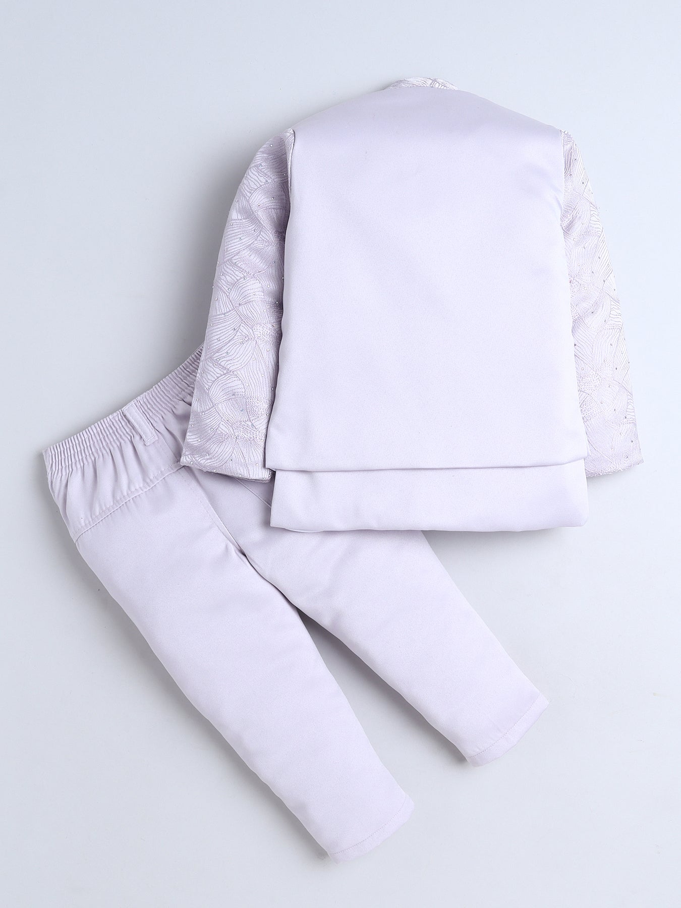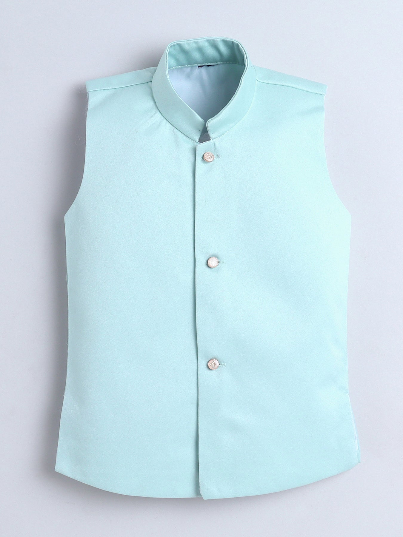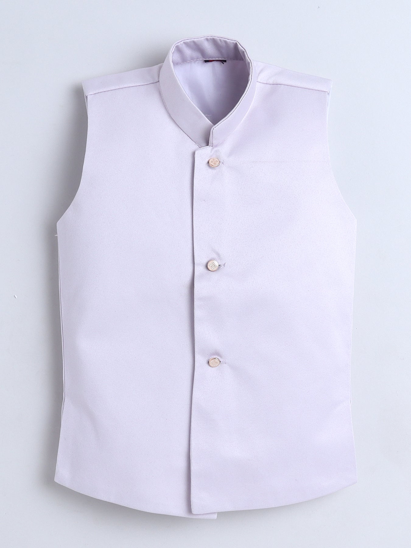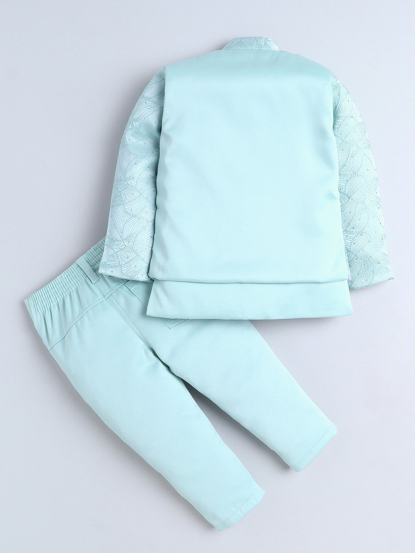 Add a royal touch to your little one’s festive look with this Sherwani Set. Designed with intricate bead embellishments and elegant embroidery, the full sleeves shrug lends a rich, traditional charm to the outfit. The sleeveless solid sherwani features a front button closure, mandarin collar, and side slits for a smart and comfortable fit, while the matching trousers complete the look with a neat and polished finish. Crafted from soft, premium fabric, this set ensures all-day comfort without compromising on style. Perfect for weddings, festive occasions, cultural celebrations, or family gatherings, this sherwani set brings together classic design and modern sophistication, giving your boy a regal and graceful appearance.