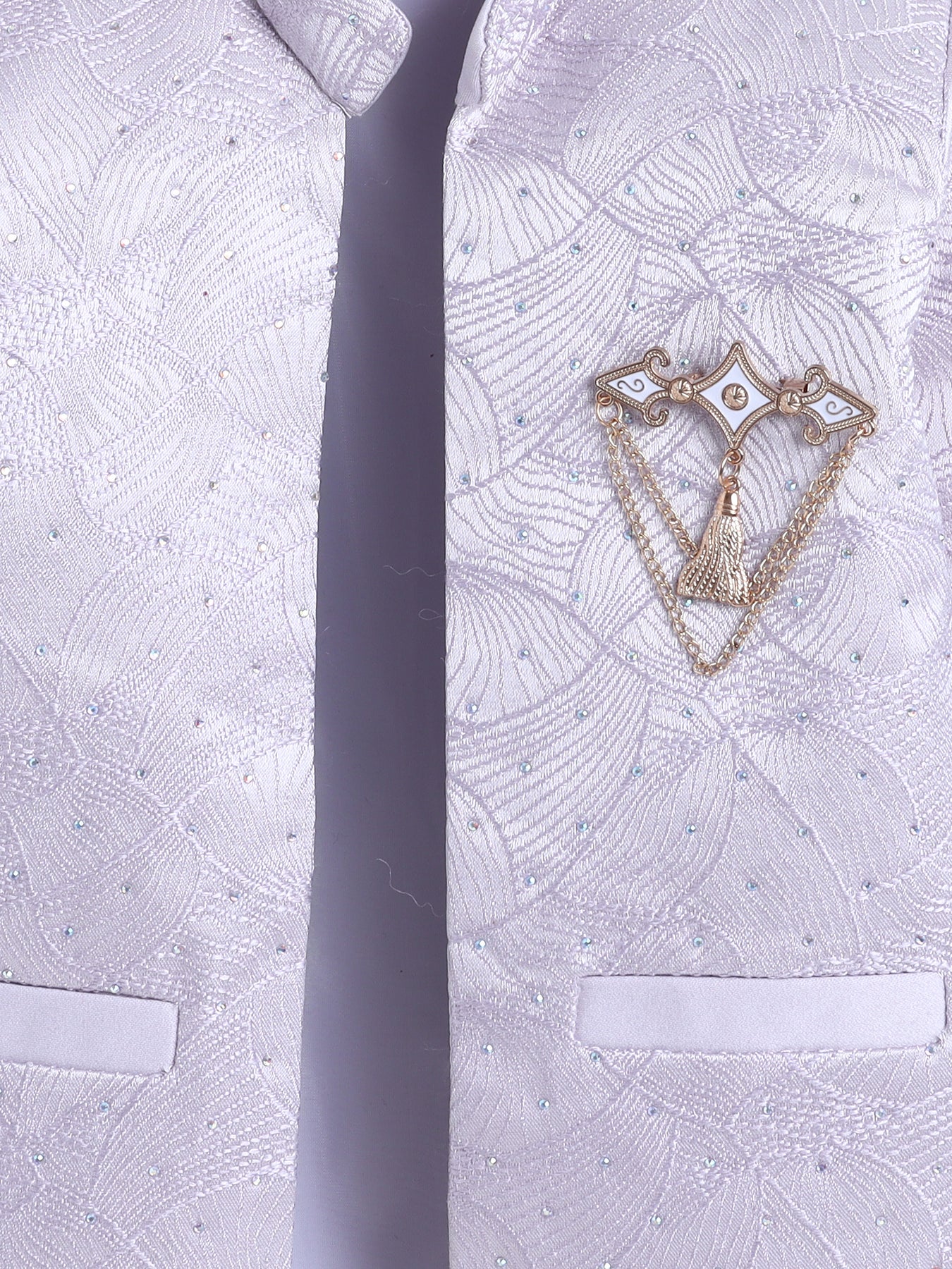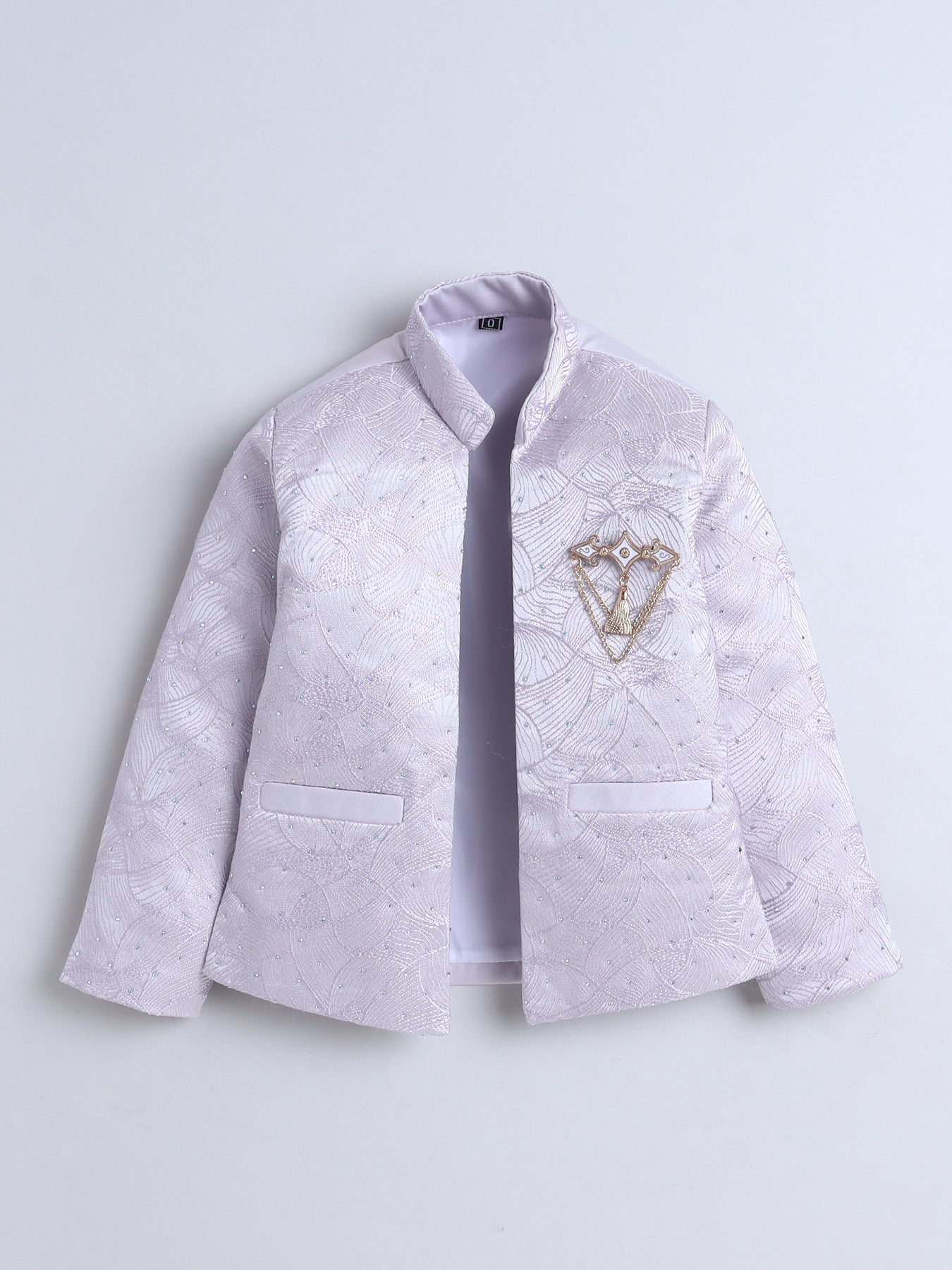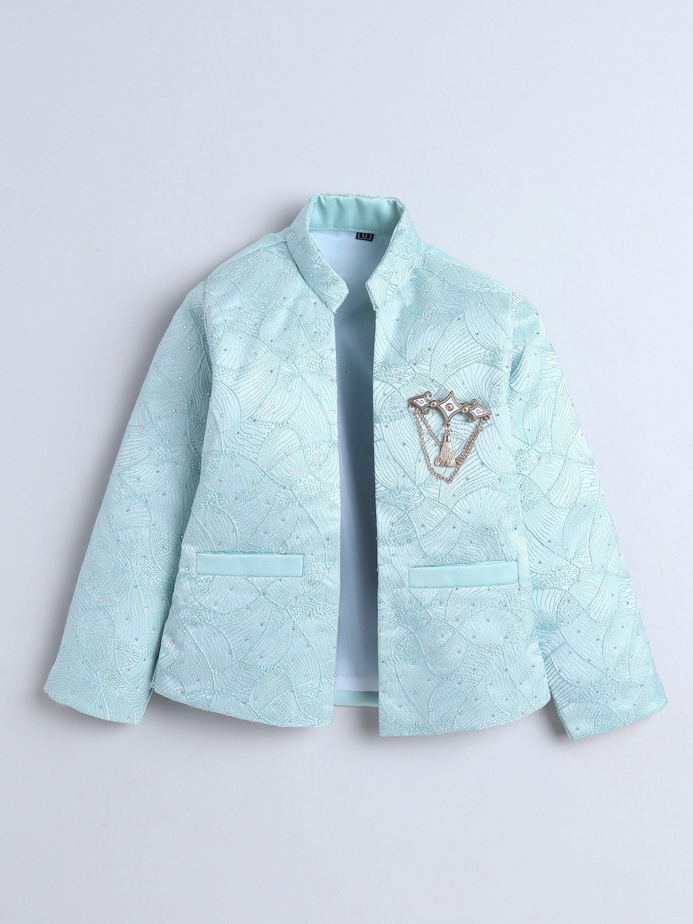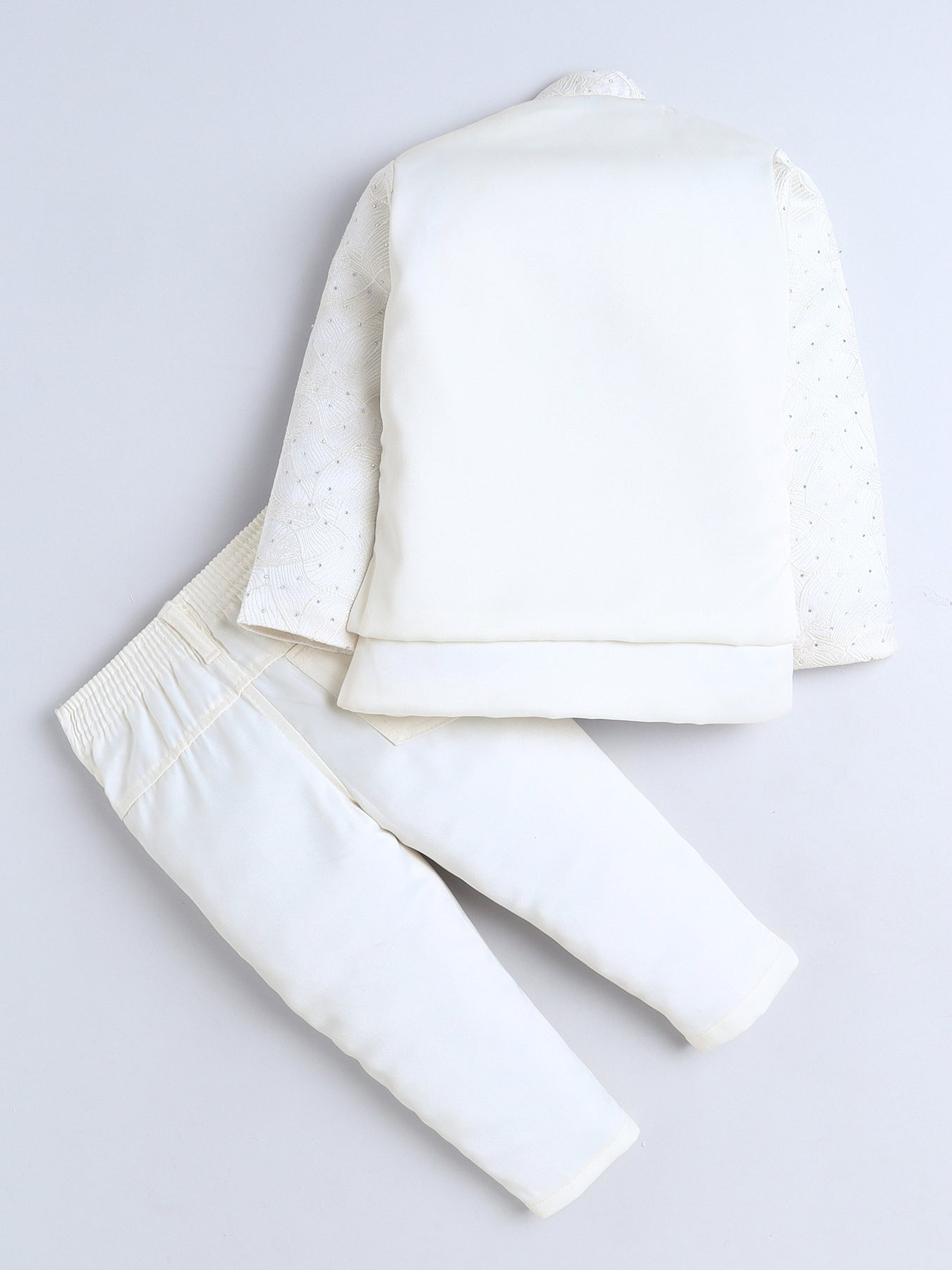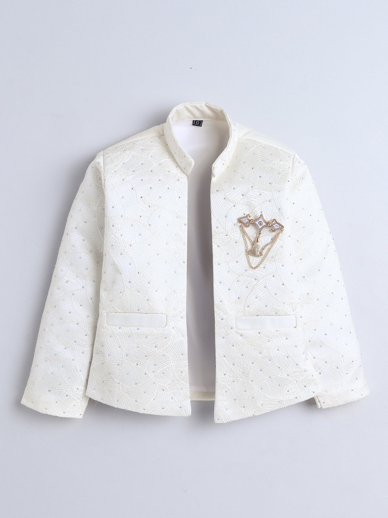 Add a royal touch to your little one’s festive look with this Sherwani Set. Designed with intricate bead embellishments and elegant embroidery, the full sleeves shrug lends a rich, traditional charm to the outfit. The sleeveless solid sherwani features a front button closure, mandarin collar, and side slits for a smart and comfortable fit, while the matching trousers complete the look with a neat and polished finish. Crafted from soft, premium fabric, this set ensures all-day comfort without compromising on style. Perfect for weddings, festive occasions, cultural celebrations, or family gatherings, this sherwani set brings together classic design and modern sophistication, giving your boy a regal and graceful appearance.
