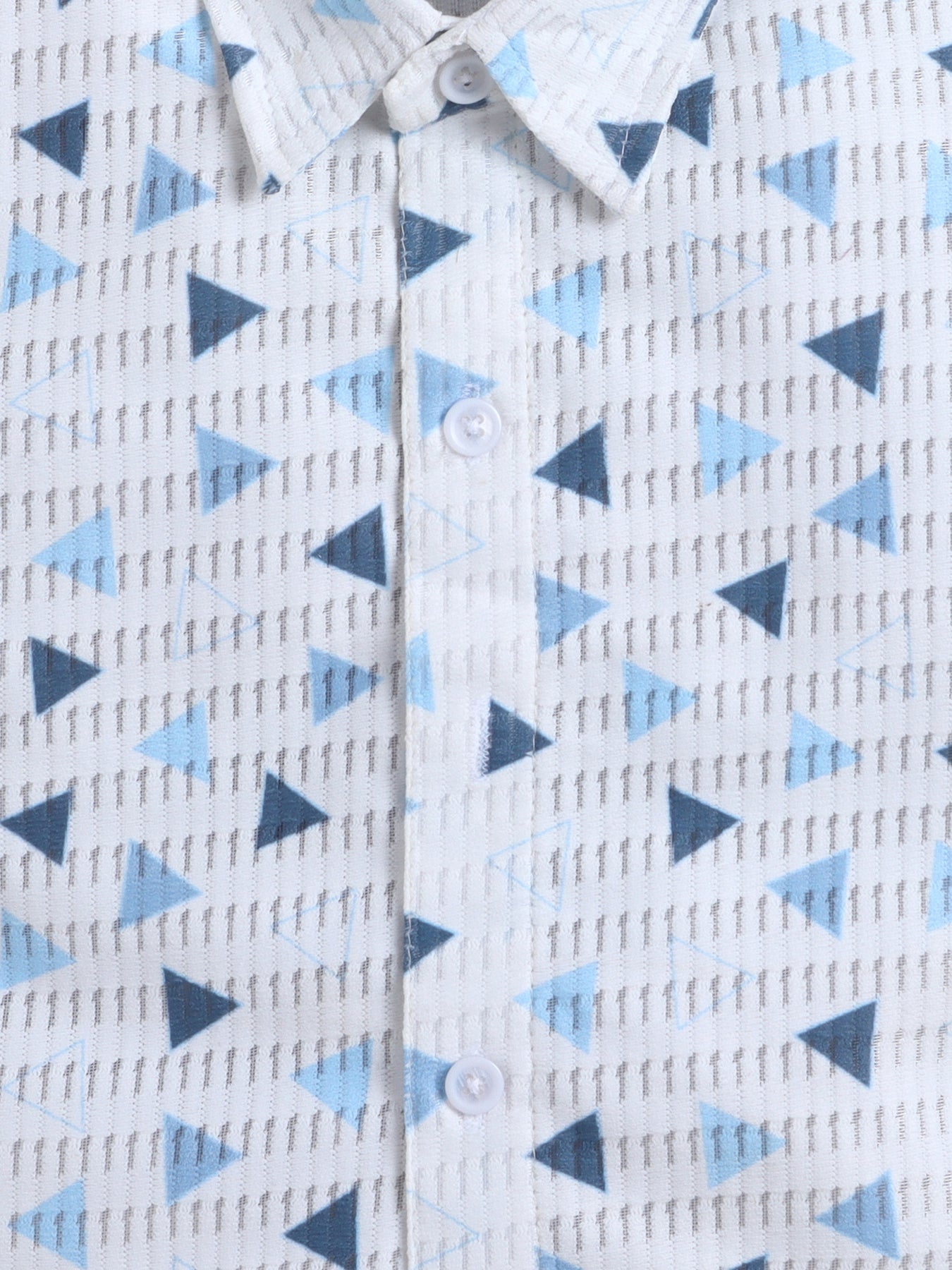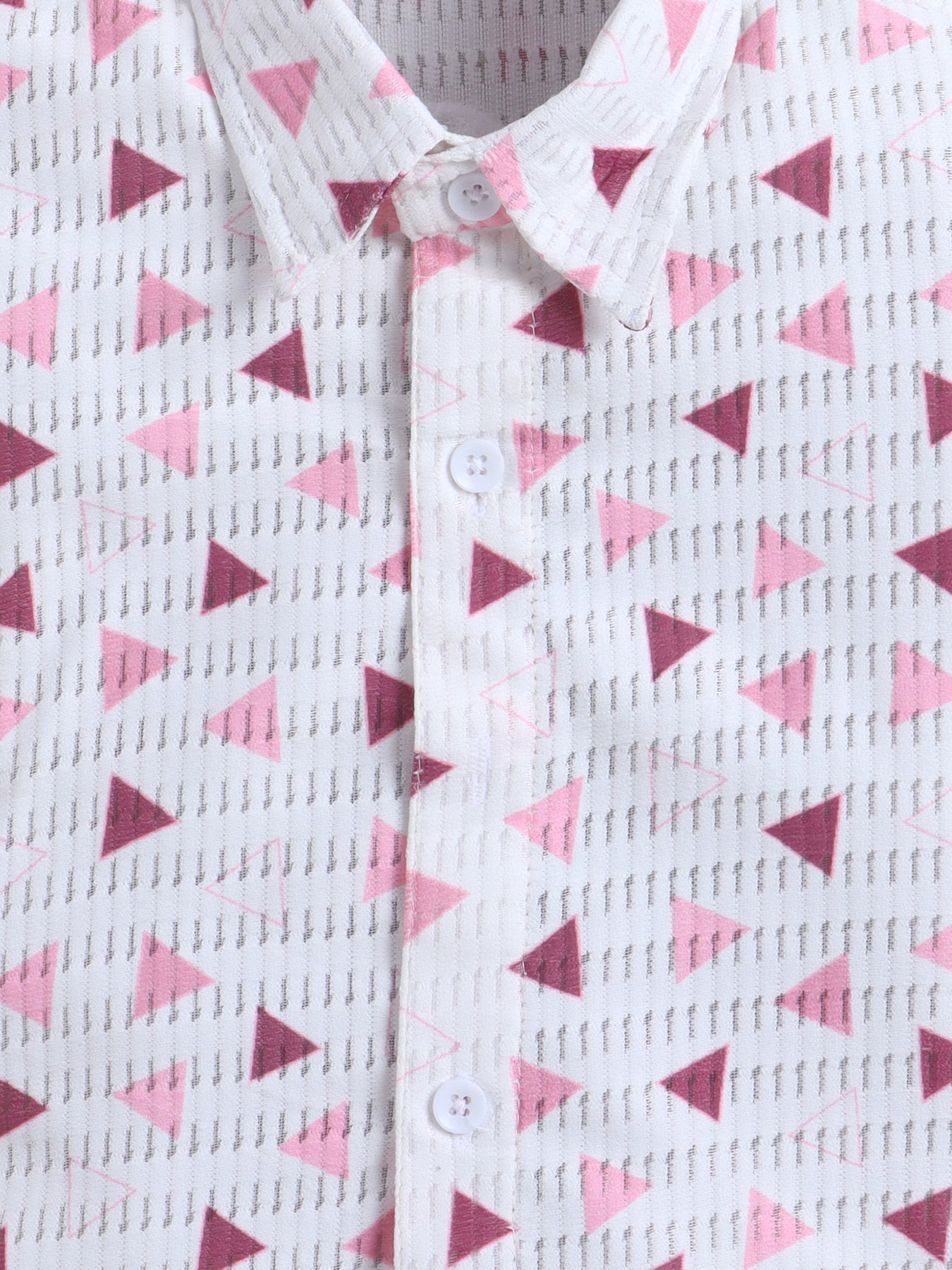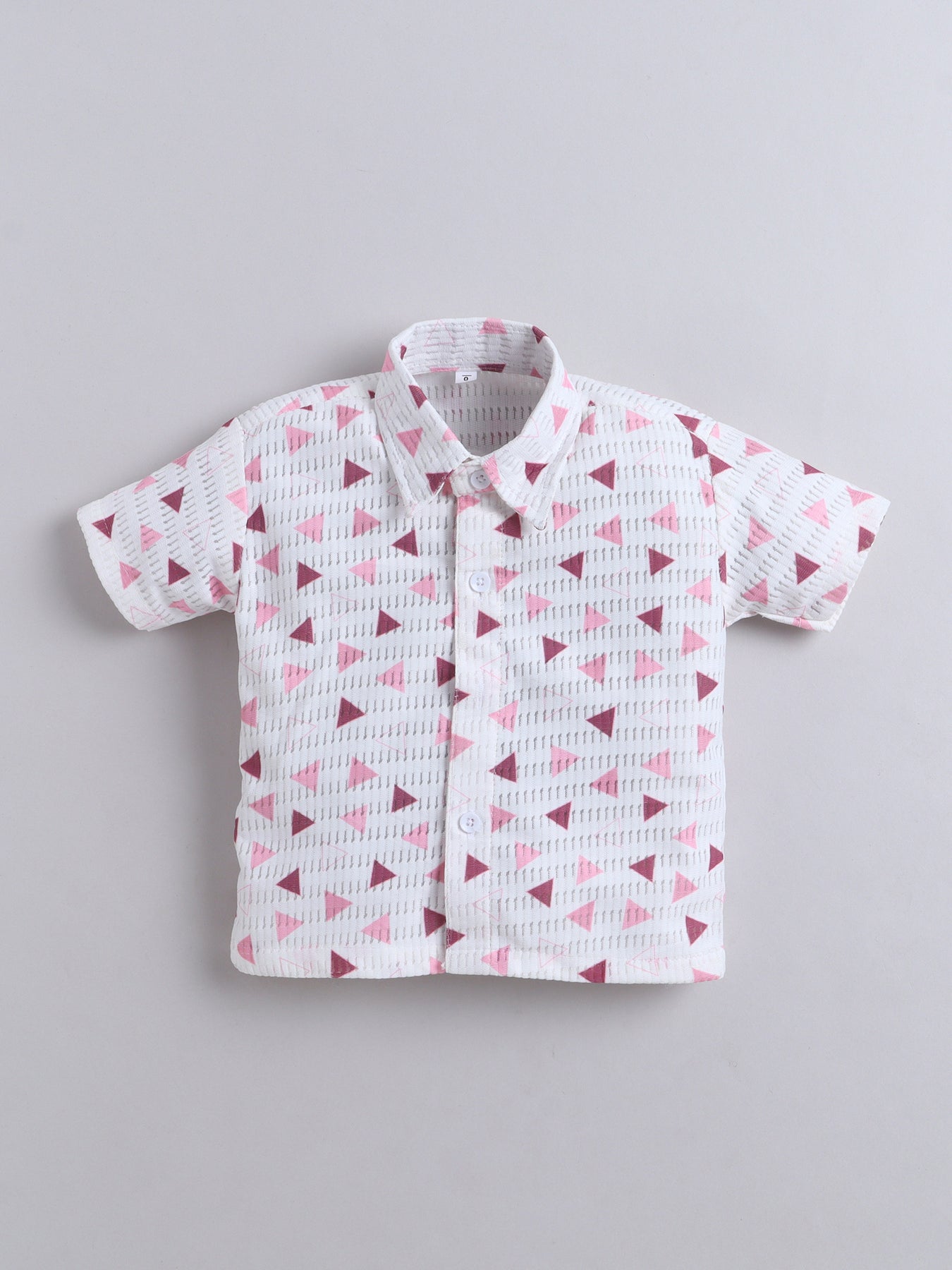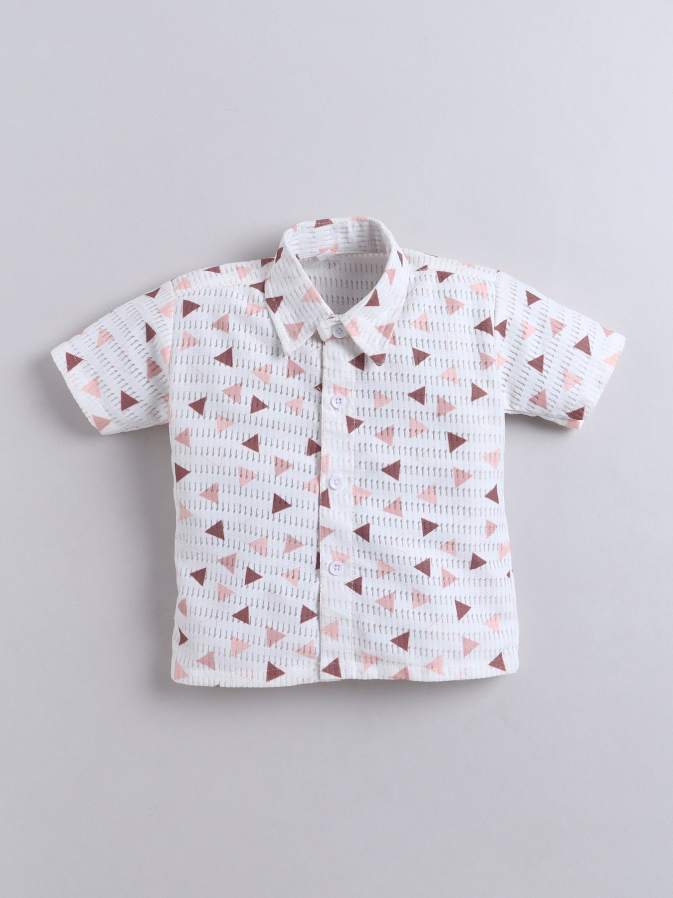 Add a playful yet stylish touch to your child’s wardrobe with this Shirt & Shorts Set With Cap, Suspender & Bow. Made from a soft cotton blend fabric, the outfit offers a comfortable feel while keeping a smart and trendy appearance. The shirt features a vibrant geometric triangle print that creates a modern and eye-catching design. Paired with matching shorts, the set is enhanced with a coordinated cap, suspenders, and a bow tie for a charming and polished look. Ideal for parties, outings, and festive occasions, this outfit ensures your little one stands out with effortless style.