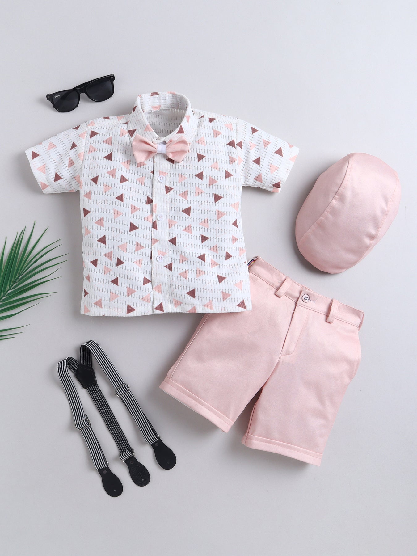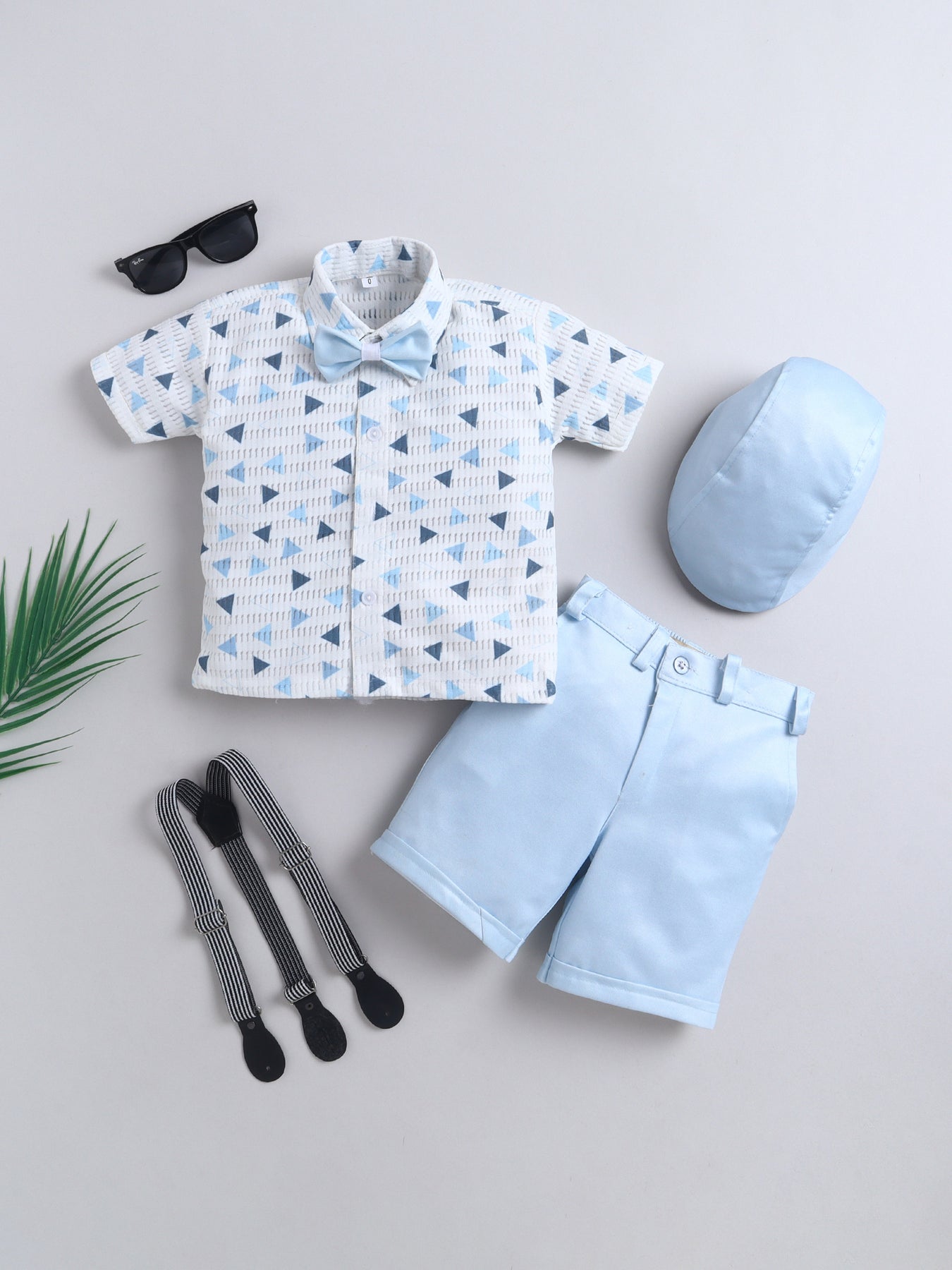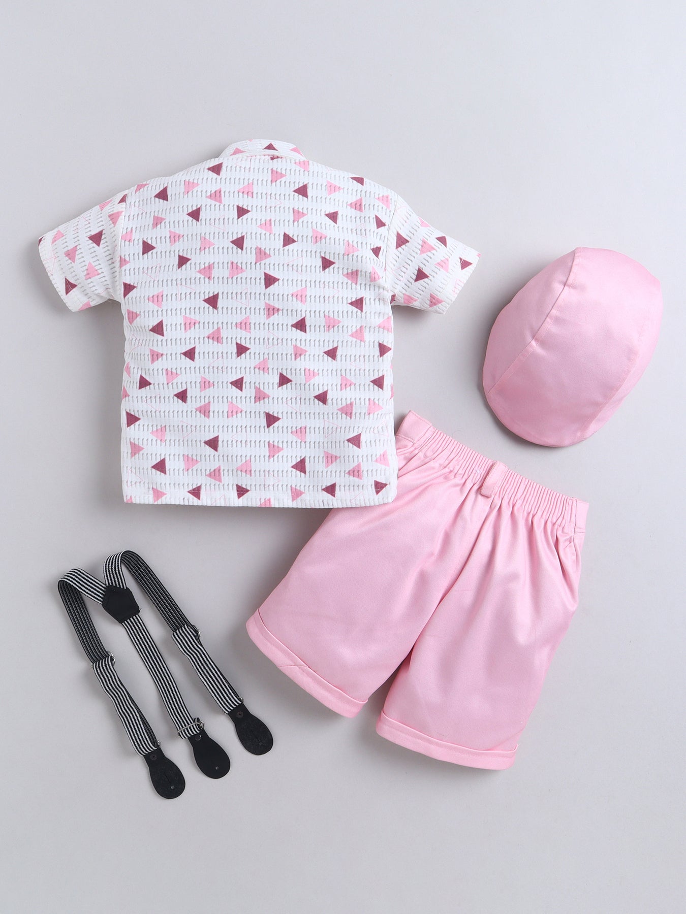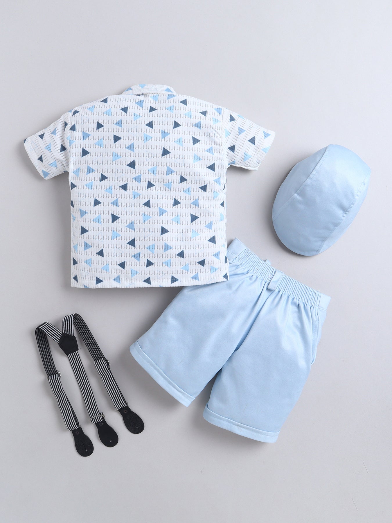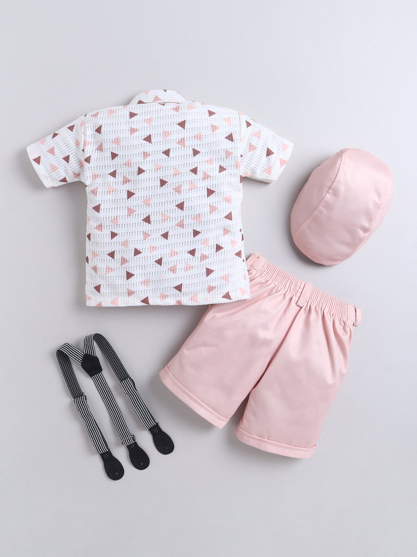 Boys Geometric Triangle Print Shirt & Shorts Set With Cap, Suspender & Bow