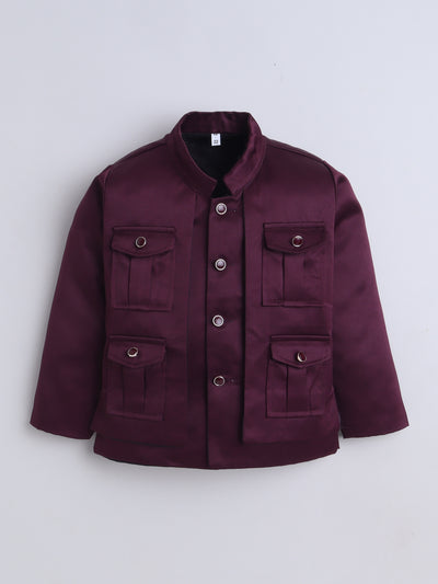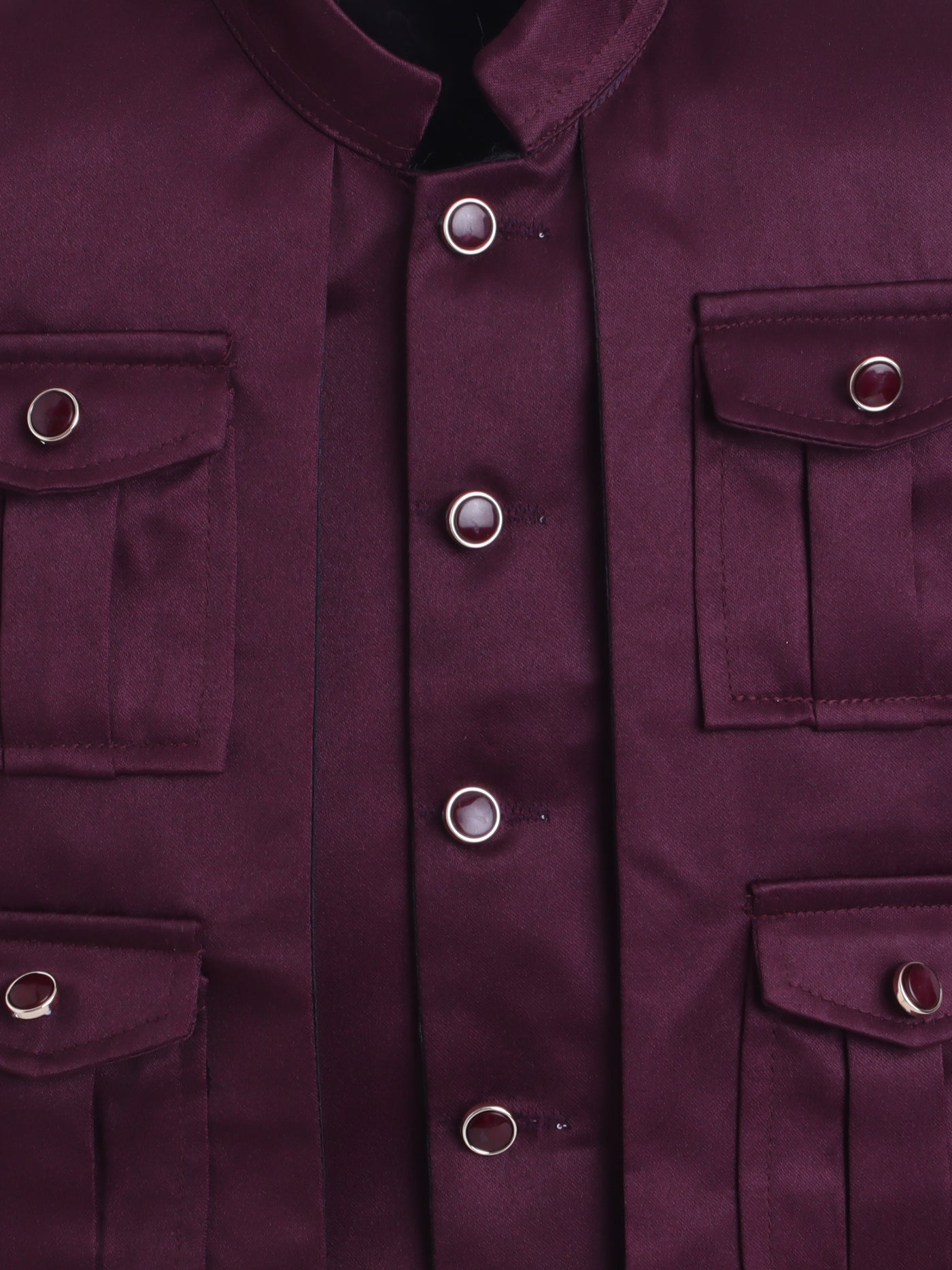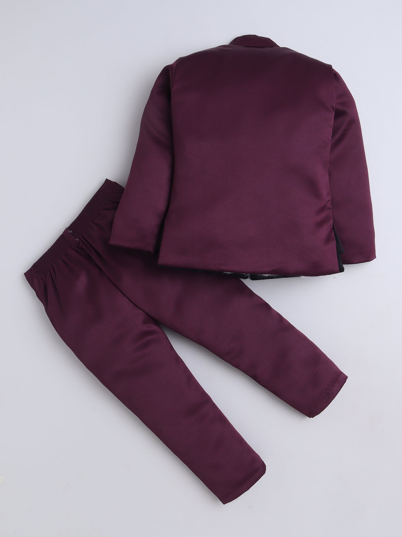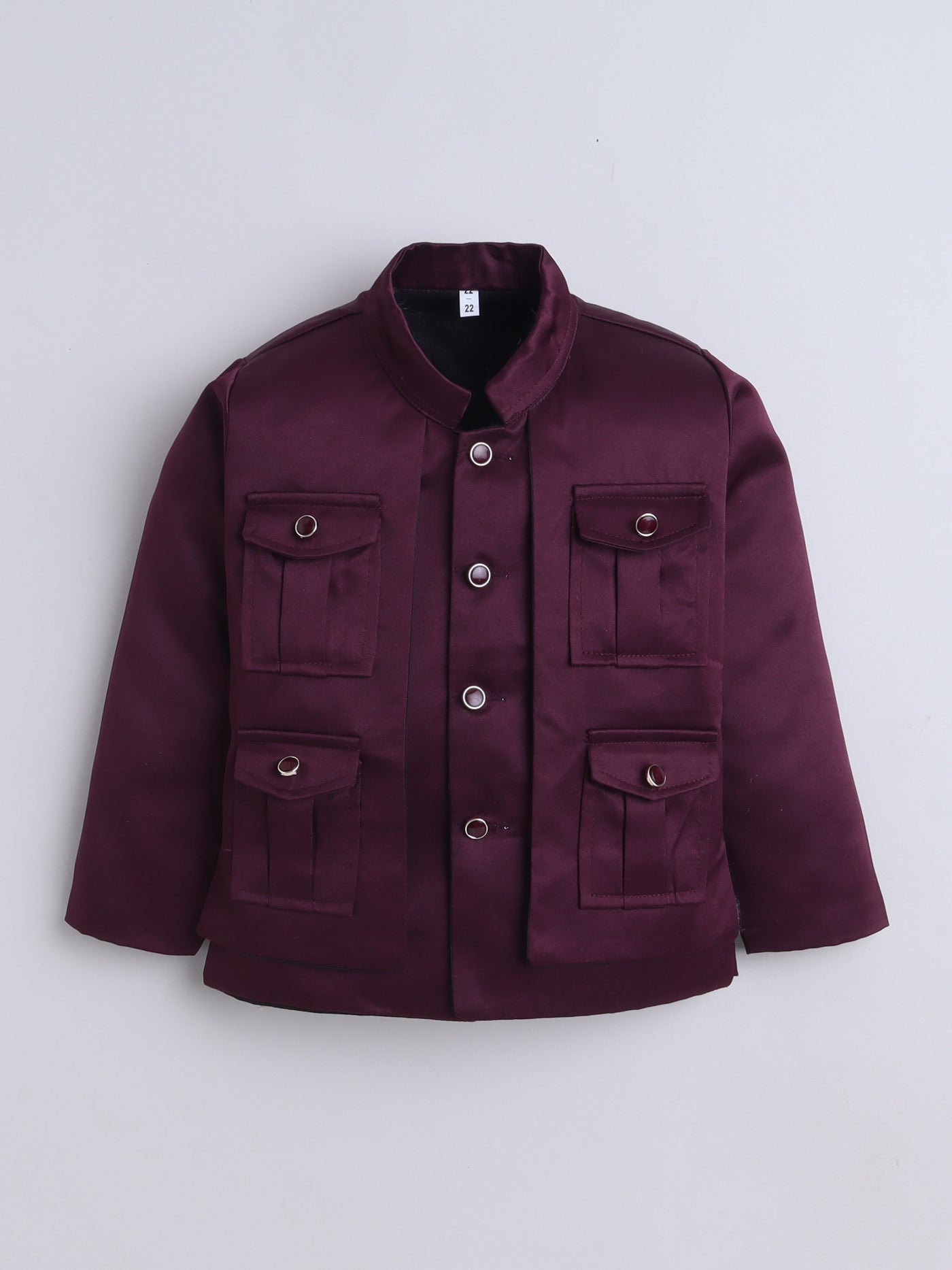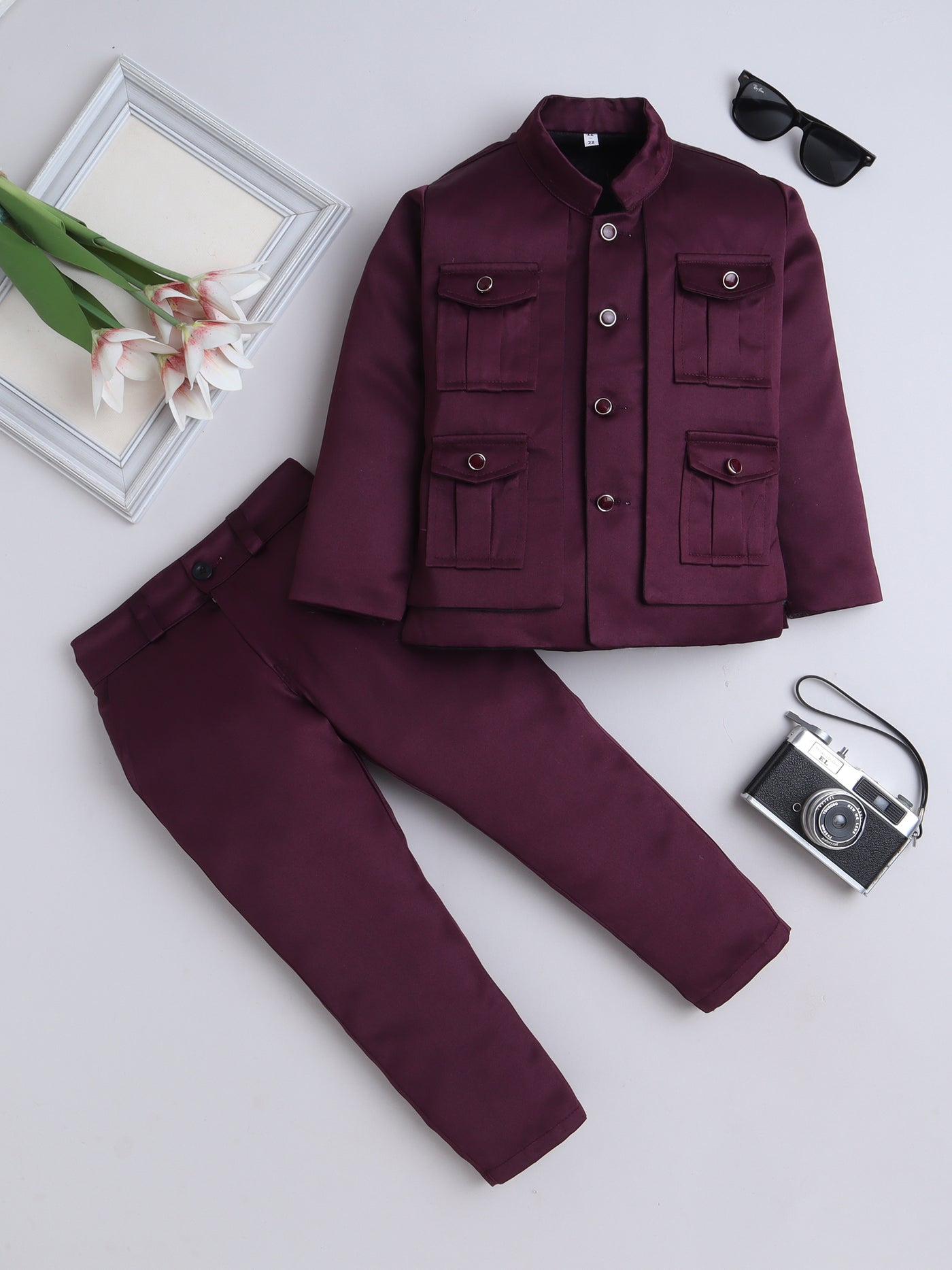 Give your little prince a royal makeover with this Indo Western suit set – the perfect fusion of traditional charm and modern sophistication. Inspired by classic Indo-Western silhouettes, this set features a smartly tailored blazer adorned with four functional flap pockets, combining utility with high fashion. The structured fit and premium fabric elevate the overall look, making it ideal for festive occasions, weddings, or formal celebrations. Designed to keep him stylish yet comfortable, the set pairs the statement blazer with matching trousers crafted for ease of movement and all-day wear. The rich color palette and refined design bring a regal appeal that stands out in any crowd. Whether it’s a cultural event or a special gathering, this ensemble ensures he looks polished, confident, and festive-ready.