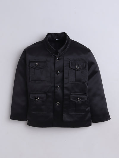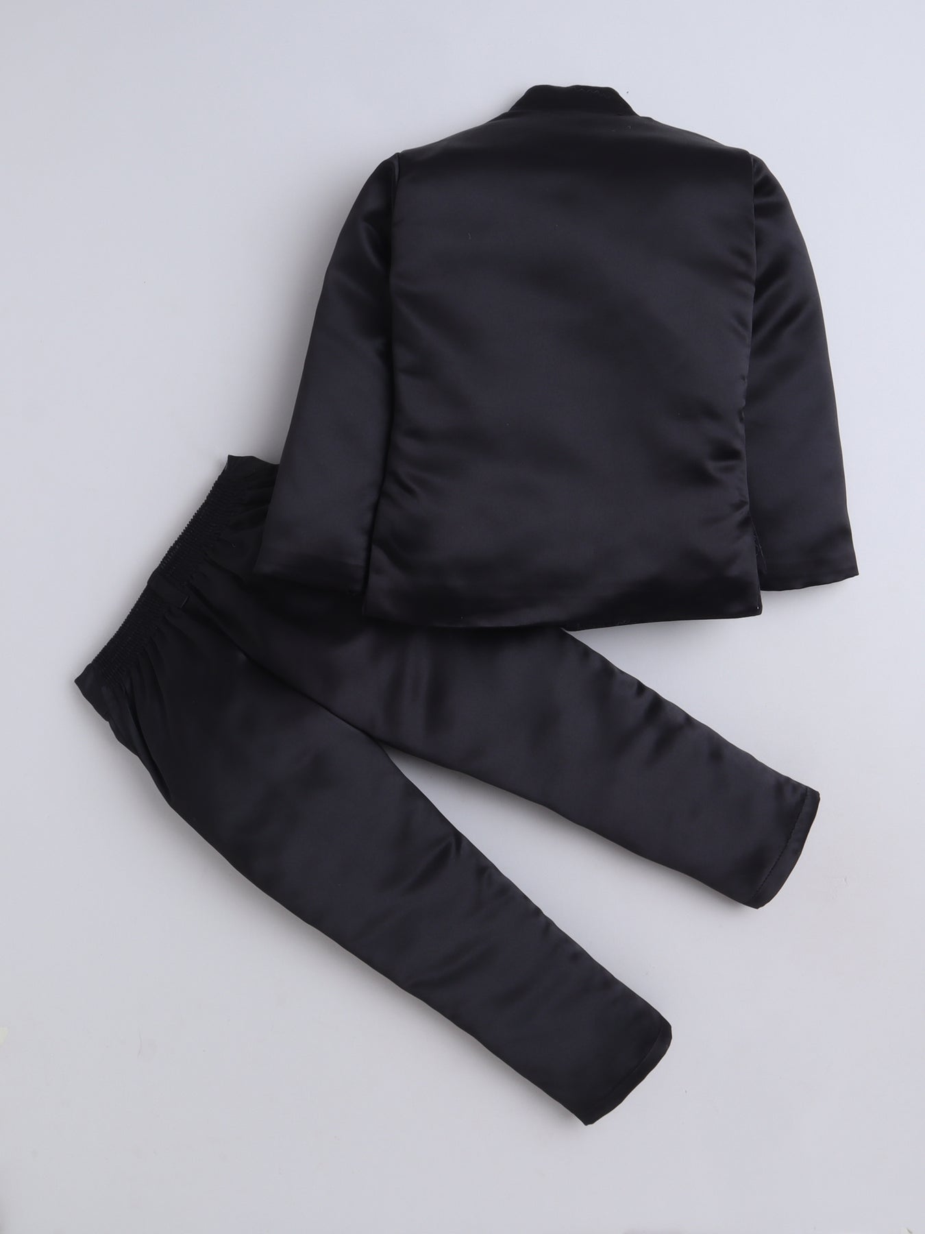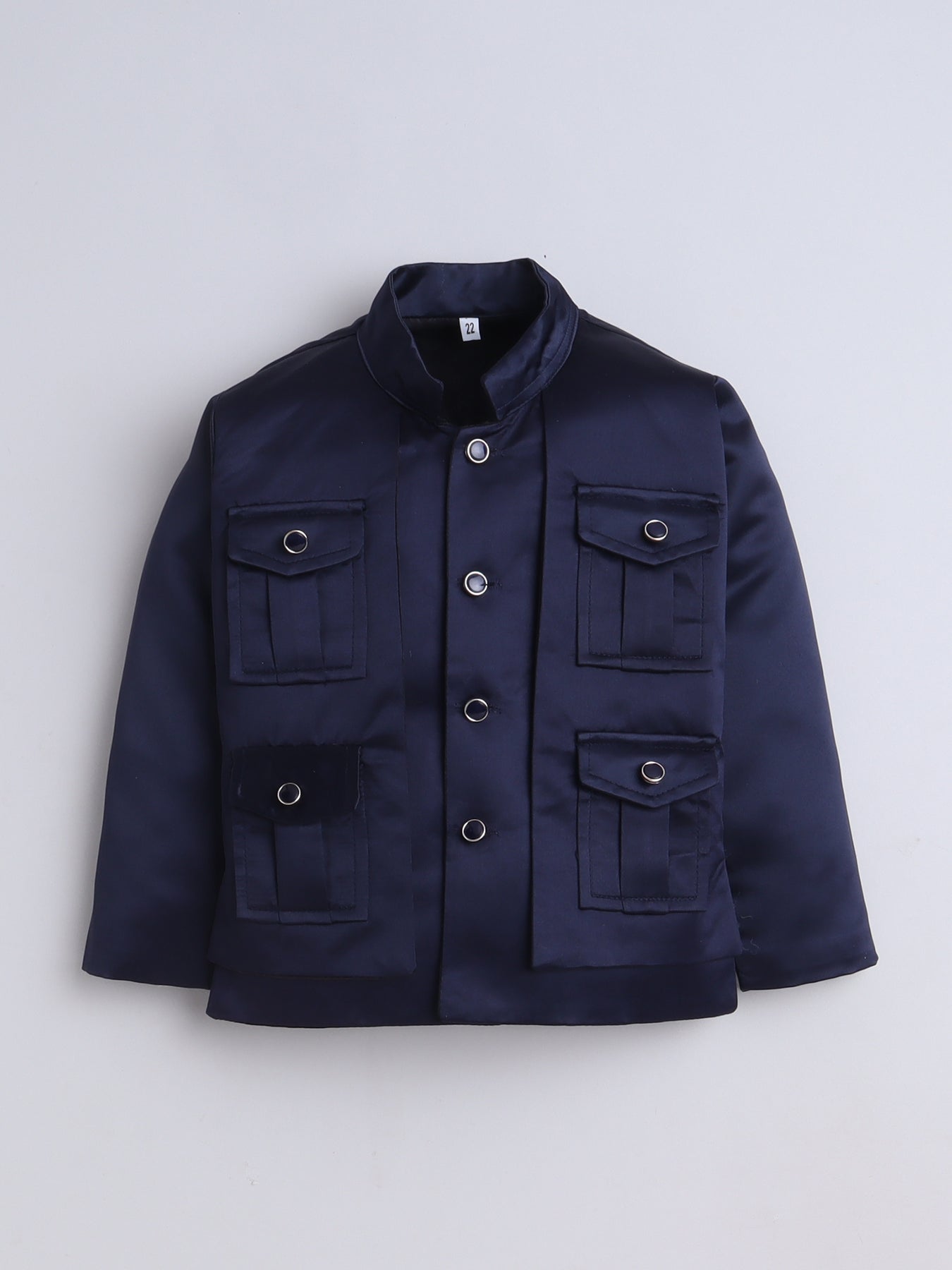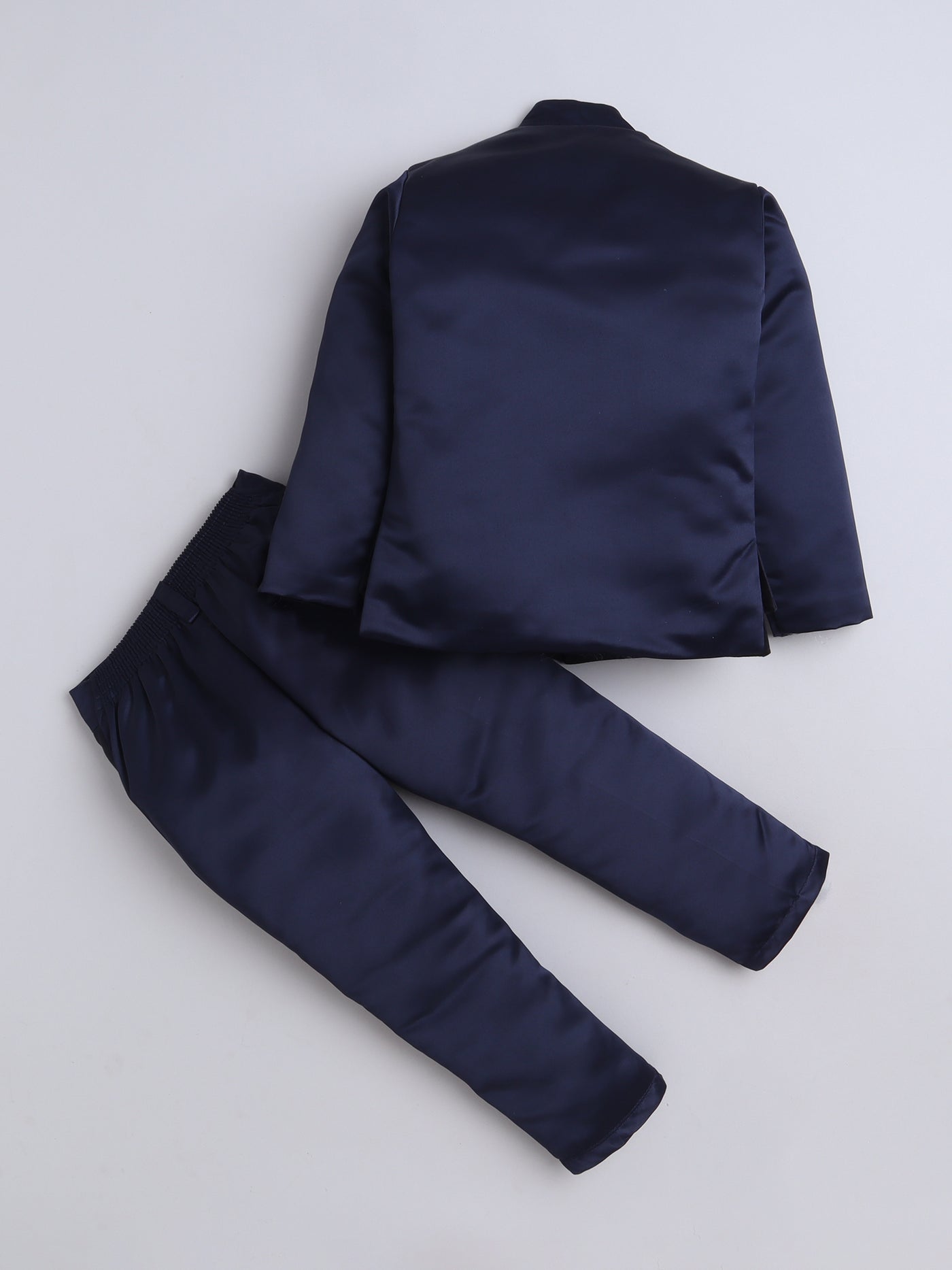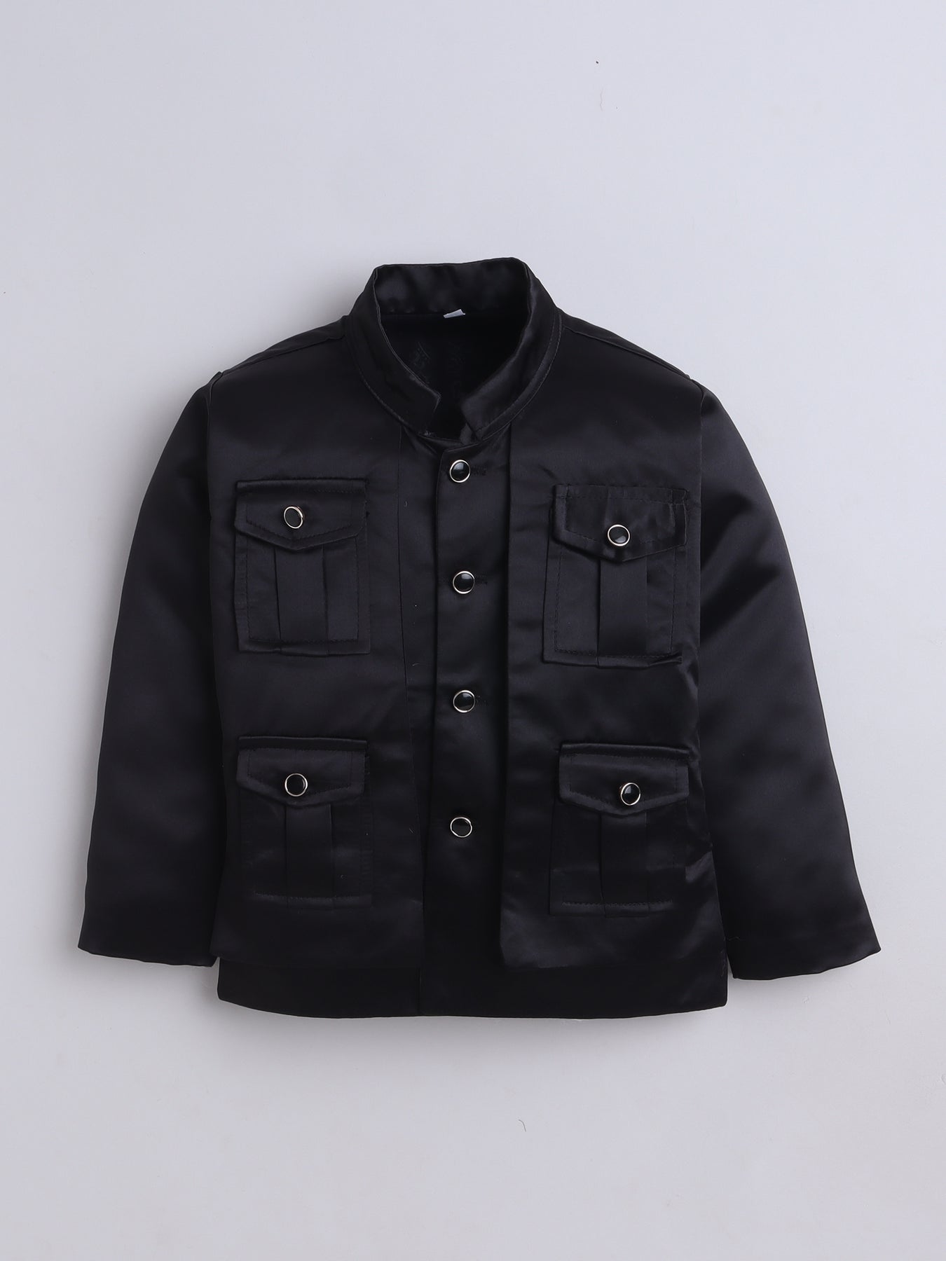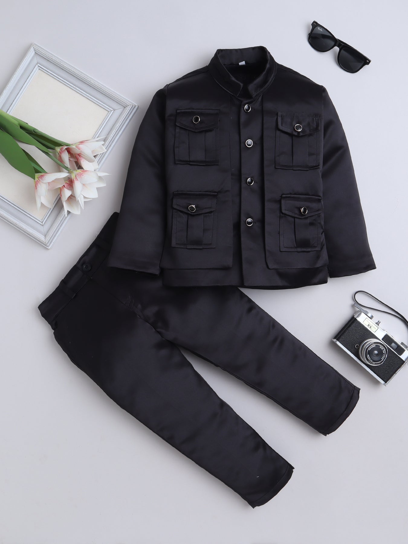 Give your little prince a royal makeover with this Indo Western suit set – the perfect fusion of traditional charm and modern sophistication. Inspired by classic Indo-Western silhouettes, this set features a smartly tailored blazer adorned with four functional flap pockets, combining utility with high fashion. The structured fit and premium fabric elevate the overall look, making it ideal for festive occasions, weddings, or formal celebrations. Designed to keep him stylish yet comfortable, the set pairs the statement blazer with matching trousers crafted for ease of movement and all-day wear. The rich color palette and refined design bring a regal appeal that stands out in any crowd. Whether it’s a cultural event or a special gathering, this ensemble ensures he looks polished, confident, and festive-ready.