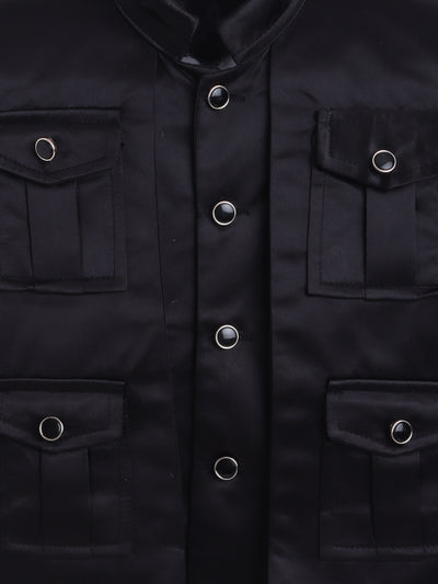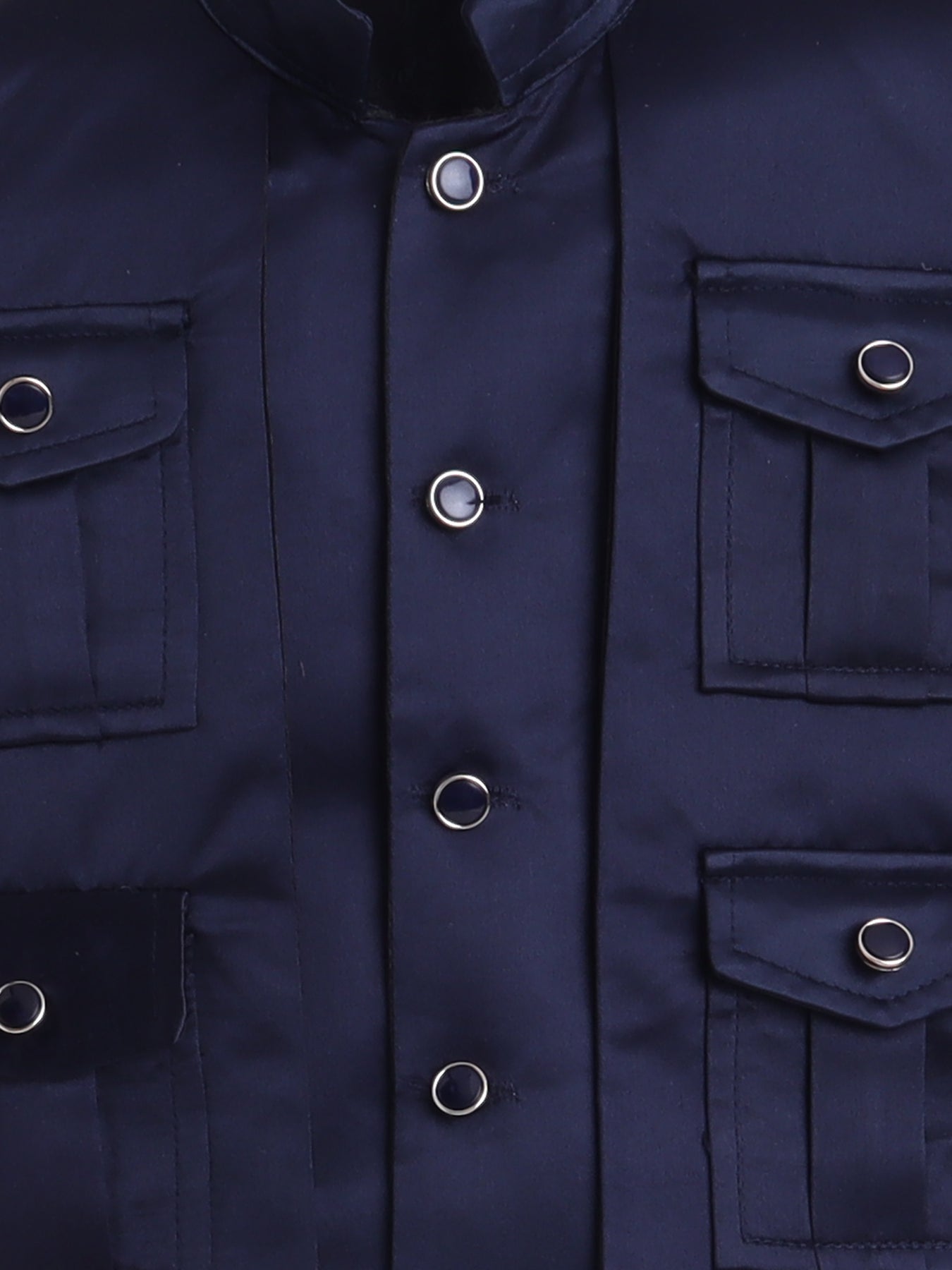 The blazer features four flap pockets that enhance both style and utility. These pockets add a fashionable layered look while offering practical space for small essentials. Designed with sharp cuts and neat stitching, it gives a well-structured and polished appearance. The button detailing complements the Indo-Western theme perfectly.