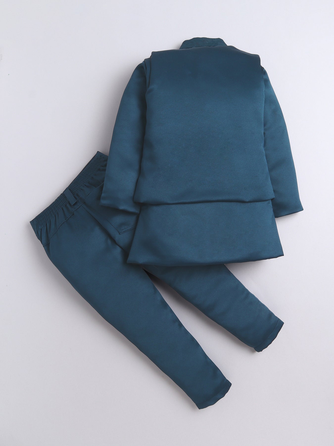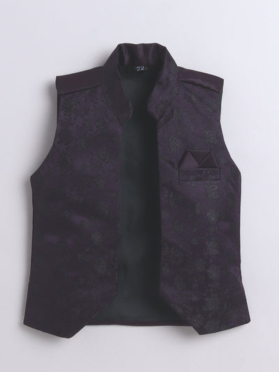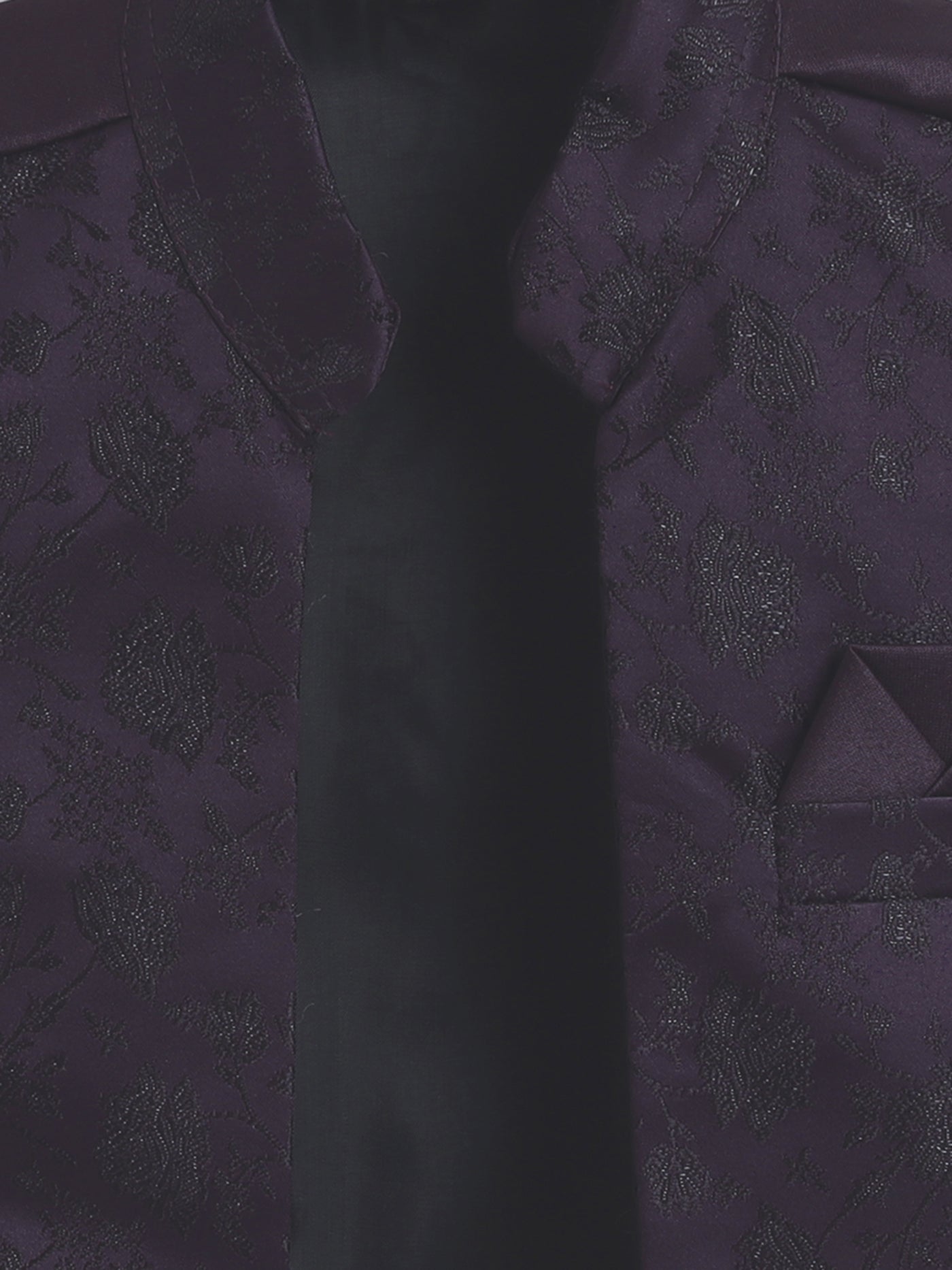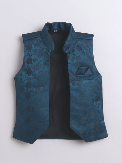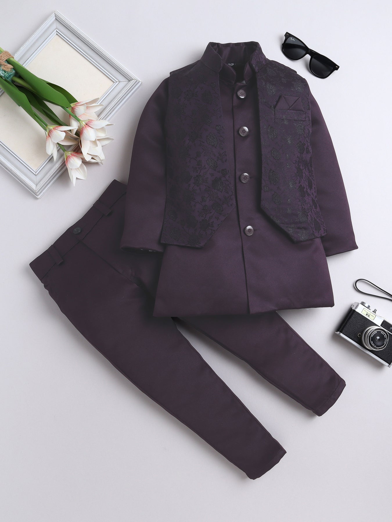 Elevate your young one’s festive and wedding look with this stylish Indo Western set. Featuring a beautifully crafted floral jacquard design jacket, this ensemble is a perfect blend of traditional charm and modern elegance. The set includes a solid color indo blazer that adds a sophisticated layer, and a pair of coordinated trousers to complete the royal look. Whether it's a wedding, festival, or cultural celebration, this outfit is designed to make your child stand out with refined grace and confident style.