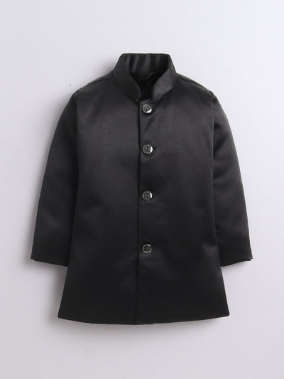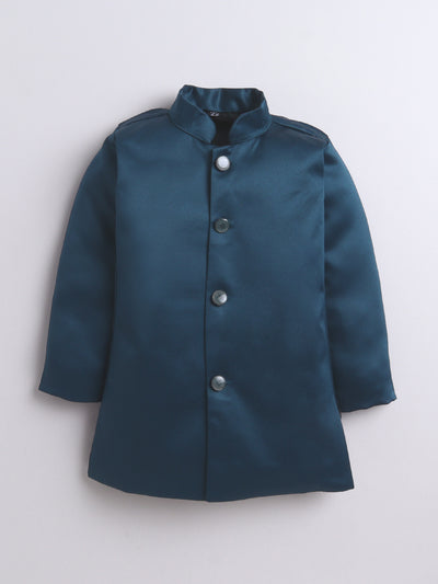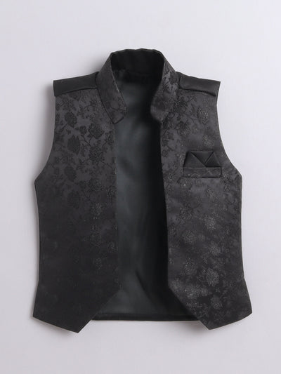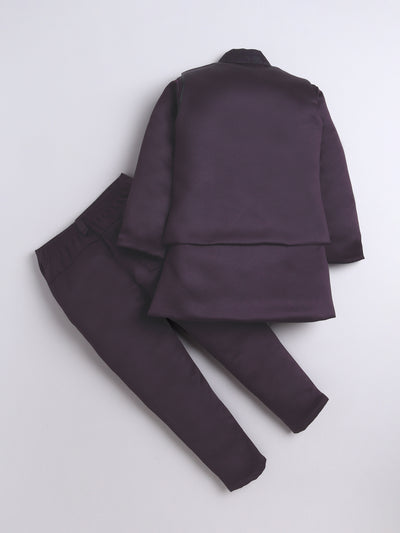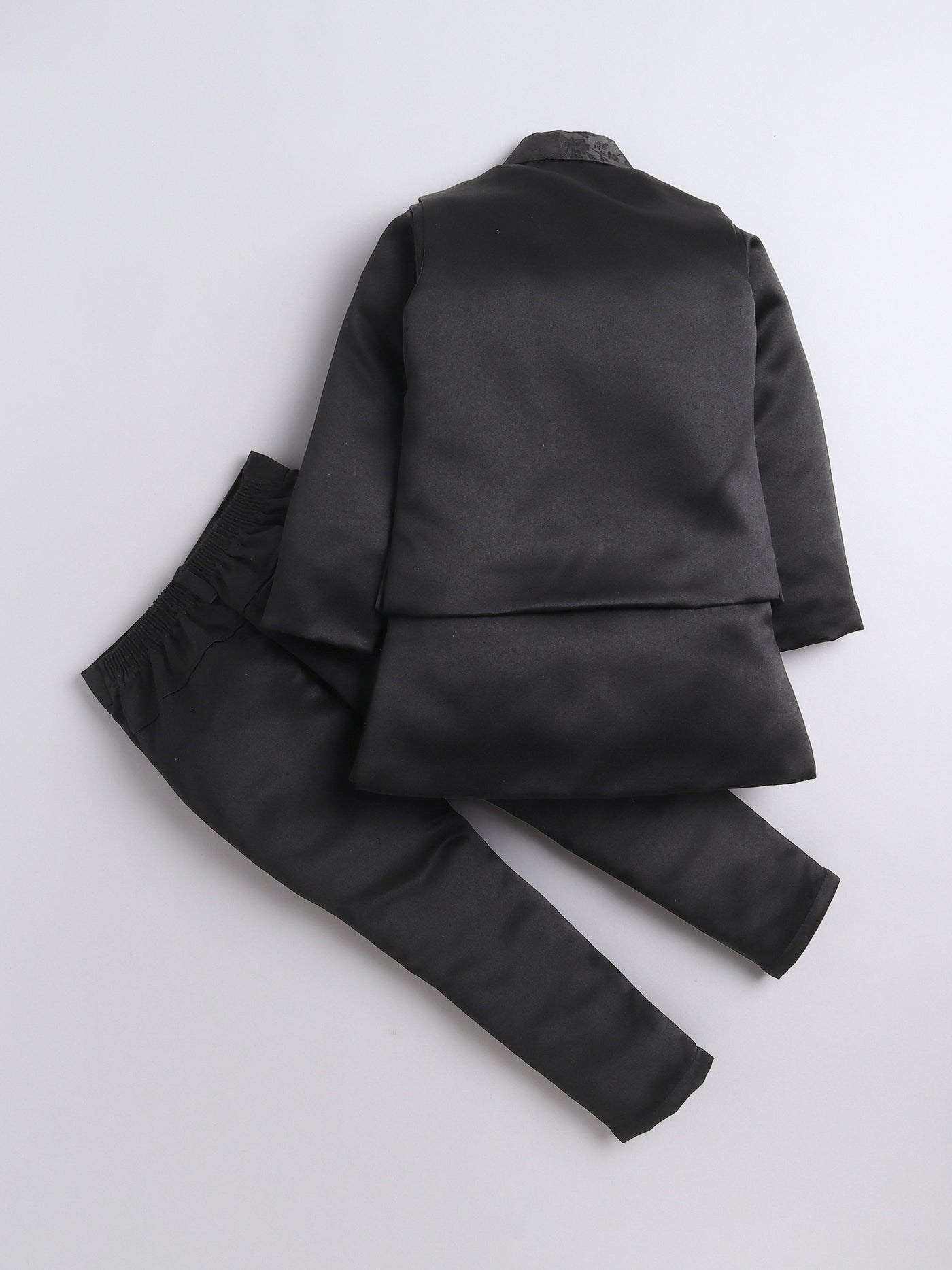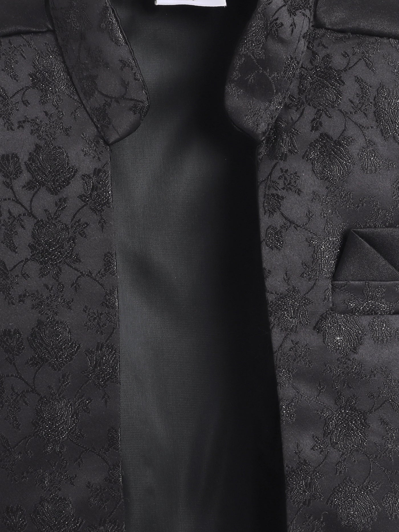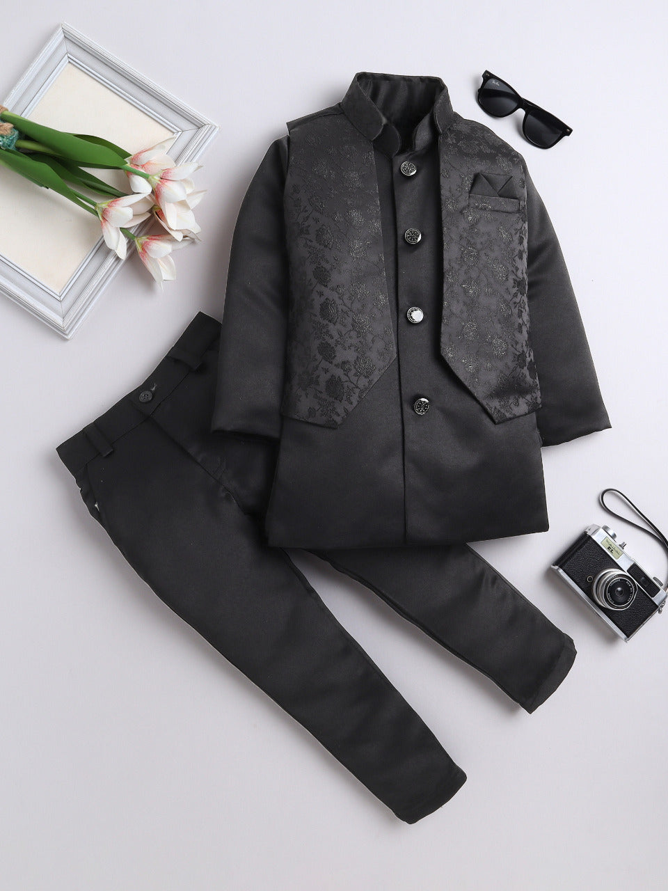 Elevate your young one’s festive and wedding look with this stylish Indo Western set. Featuring a beautifully crafted floral jacquard design jacket, this ensemble is a perfect blend of traditional charm and modern elegance. The set includes a solid color indo blazer that adds a sophisticated layer, and a pair of coordinated trousers to complete the royal look. Whether it's a wedding, festival, or cultural celebration, this outfit is designed to make your child stand out with refined grace and confident style.
