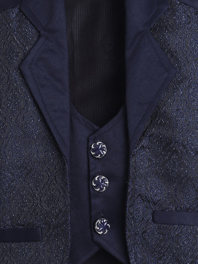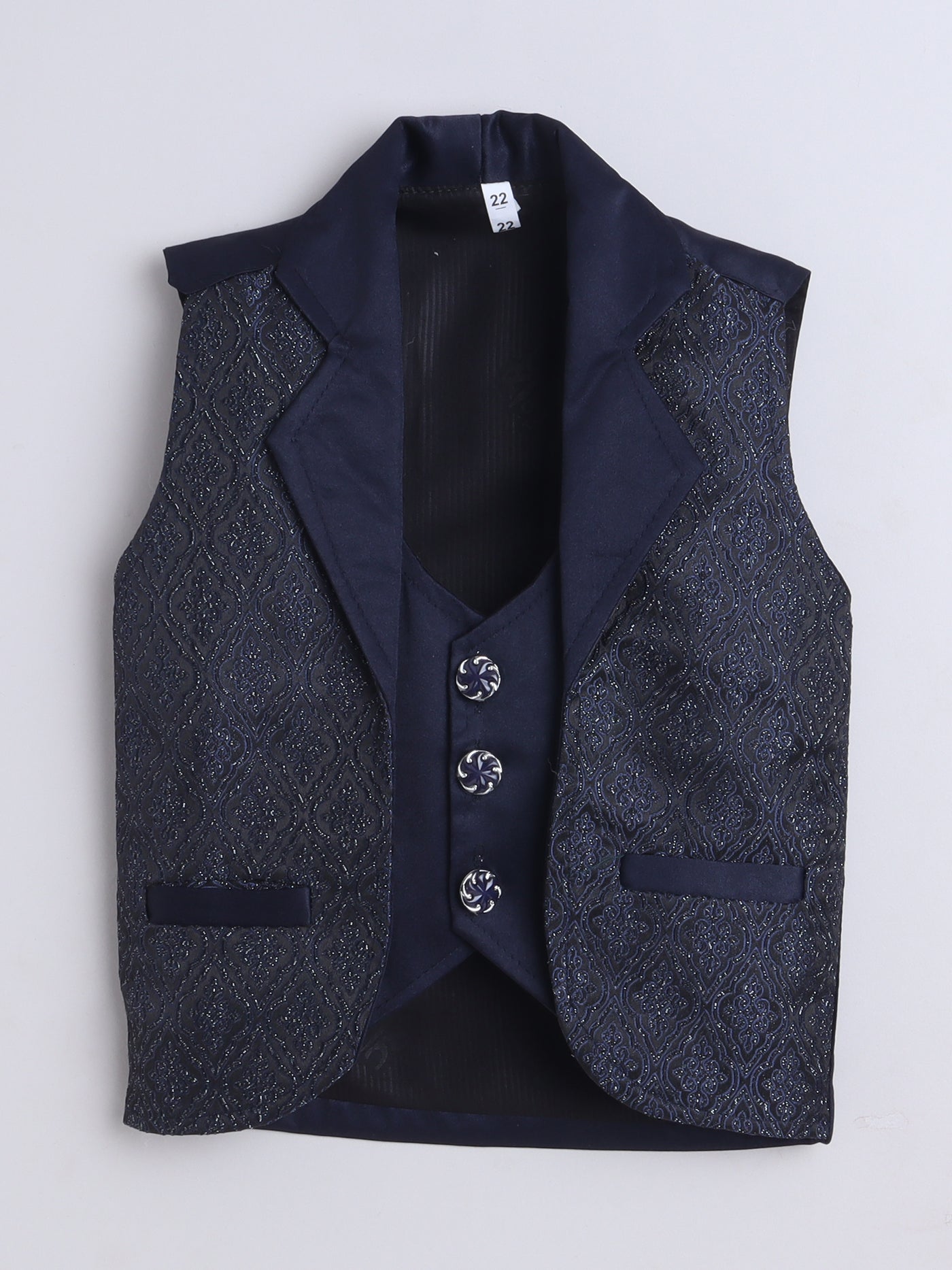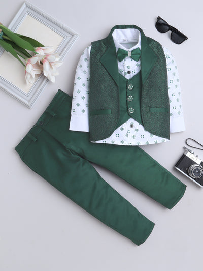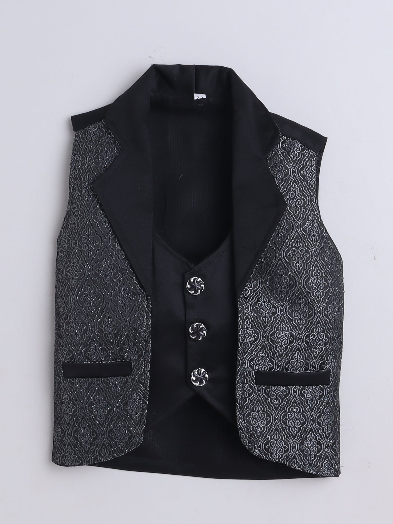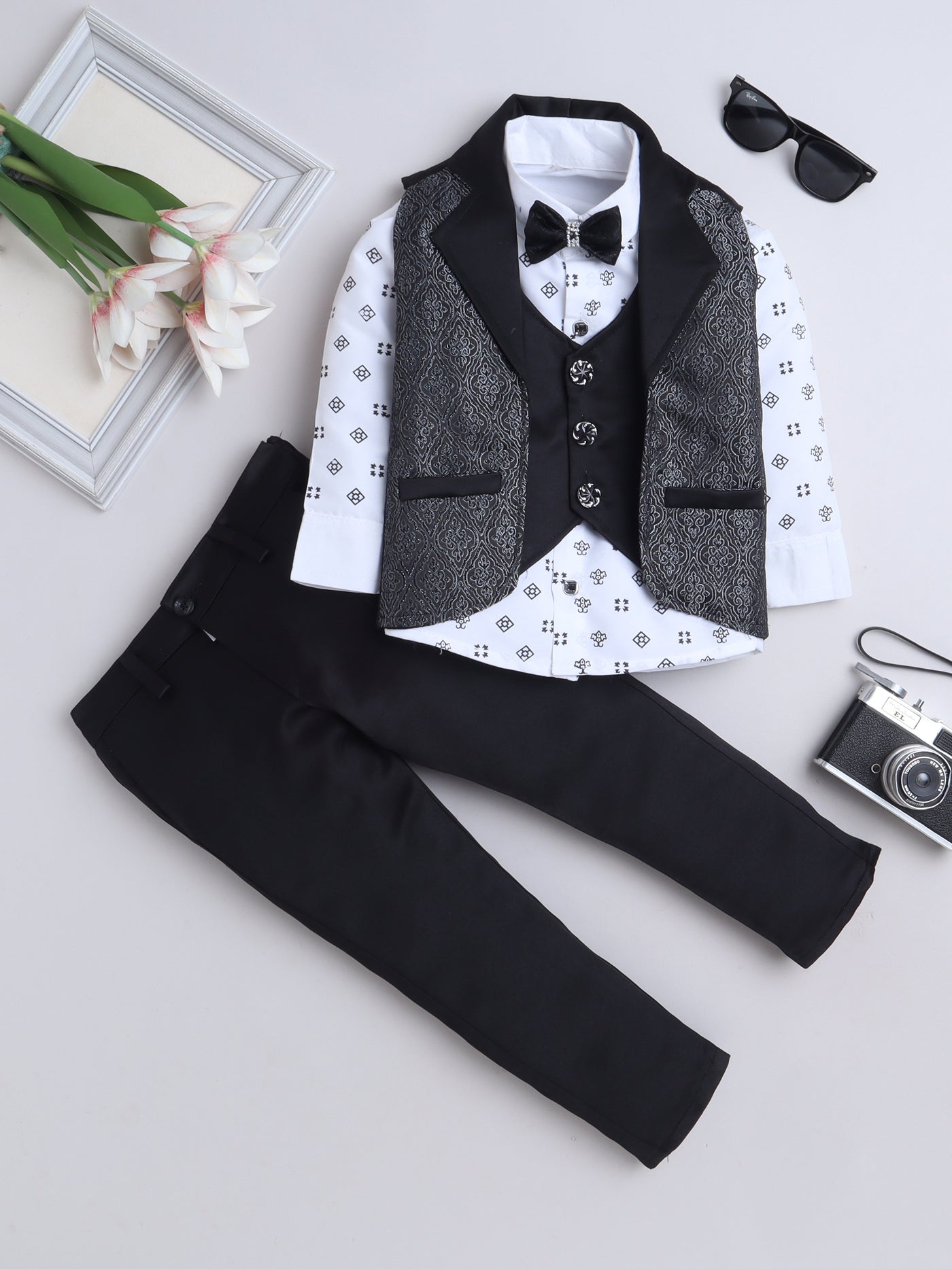 Dress your little prince in timeless elegance with this charming 3-piece suit set. Featuring a stylish printed shirt that adds a dash of playful personality, paired with a solid trouser for a classic, polished look, this ensemble strikes the perfect balance between tradition and trend. The real highlight is the Jacquard woven design waistcoat, crafted with intricate patterns that exude a rich, luxurious feel — making it ideal for festive occasions, weddings, and special celebrations. A matching bowtie completes the look, adding a smart and adorable touch. Designed with comfort and flair, this set promises to make your boy the center of attention wherever he goes.