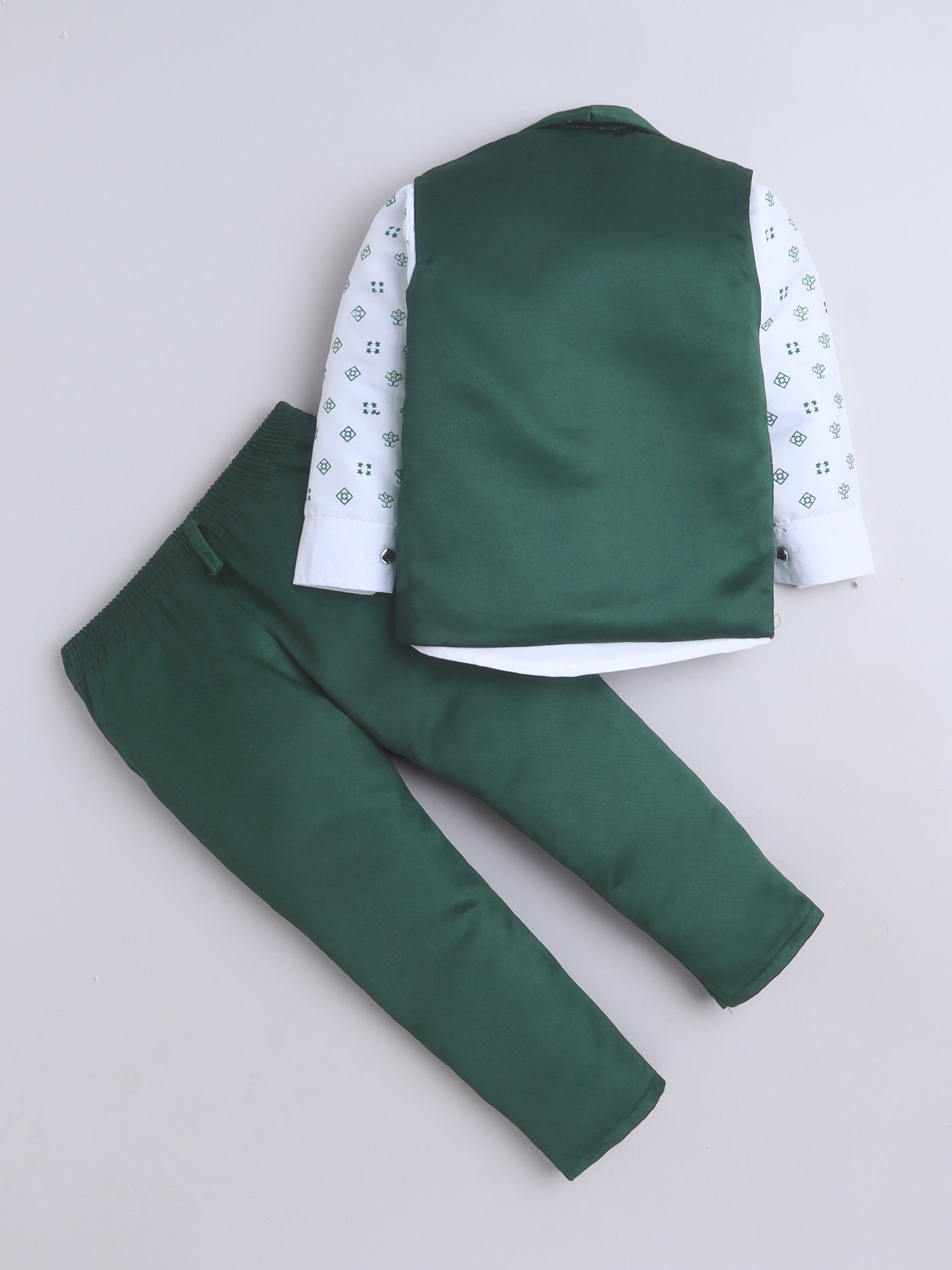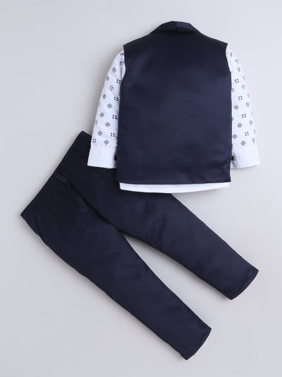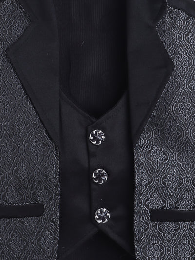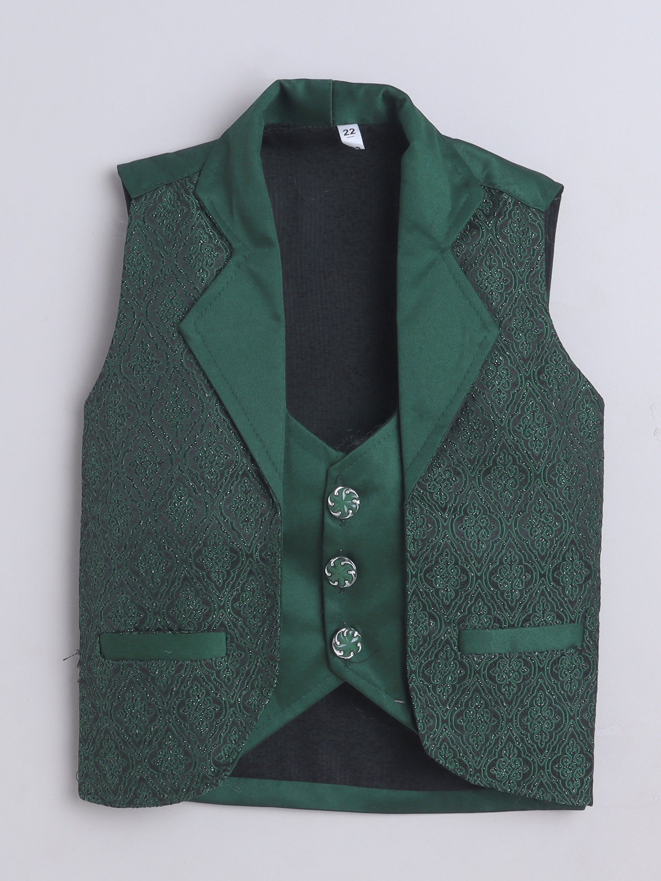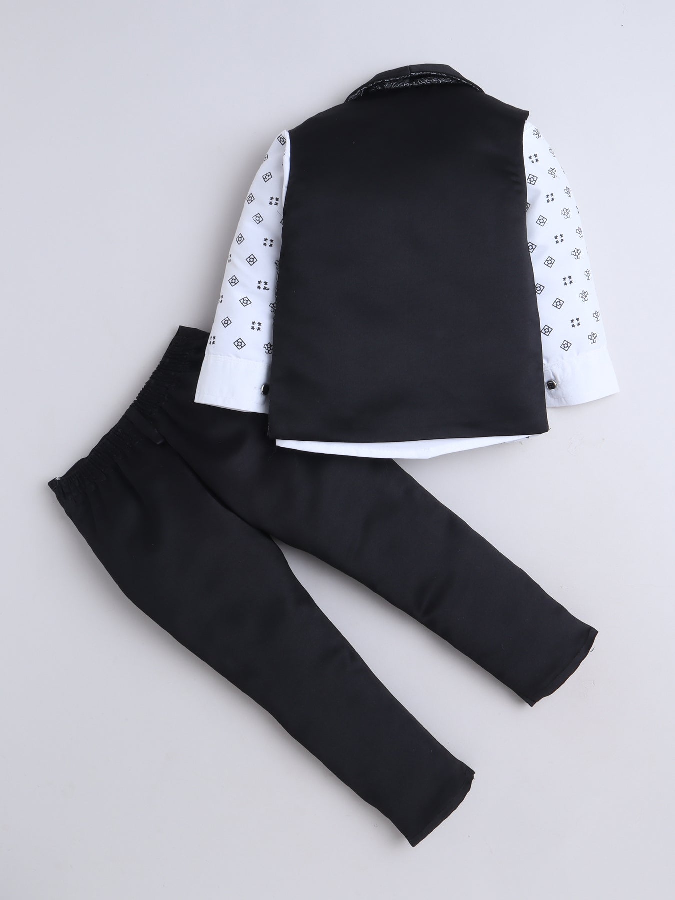 Dress your little prince in timeless elegance with this charming 3-piece suit set. Featuring a stylish printed shirt that adds a dash of playful personality, paired with a solid trouser for a classic, polished look, this ensemble strikes the perfect balance between tradition and trend. The real highlight is the Jacquard woven design waistcoat, crafted with intricate patterns that exude a rich, luxurious feel — making it ideal for festive occasions, weddings, and special celebrations. A matching bowtie completes the look, adding a smart and adorable touch. Designed with comfort and flair, this set promises to make your boy the center of attention wherever he goes.