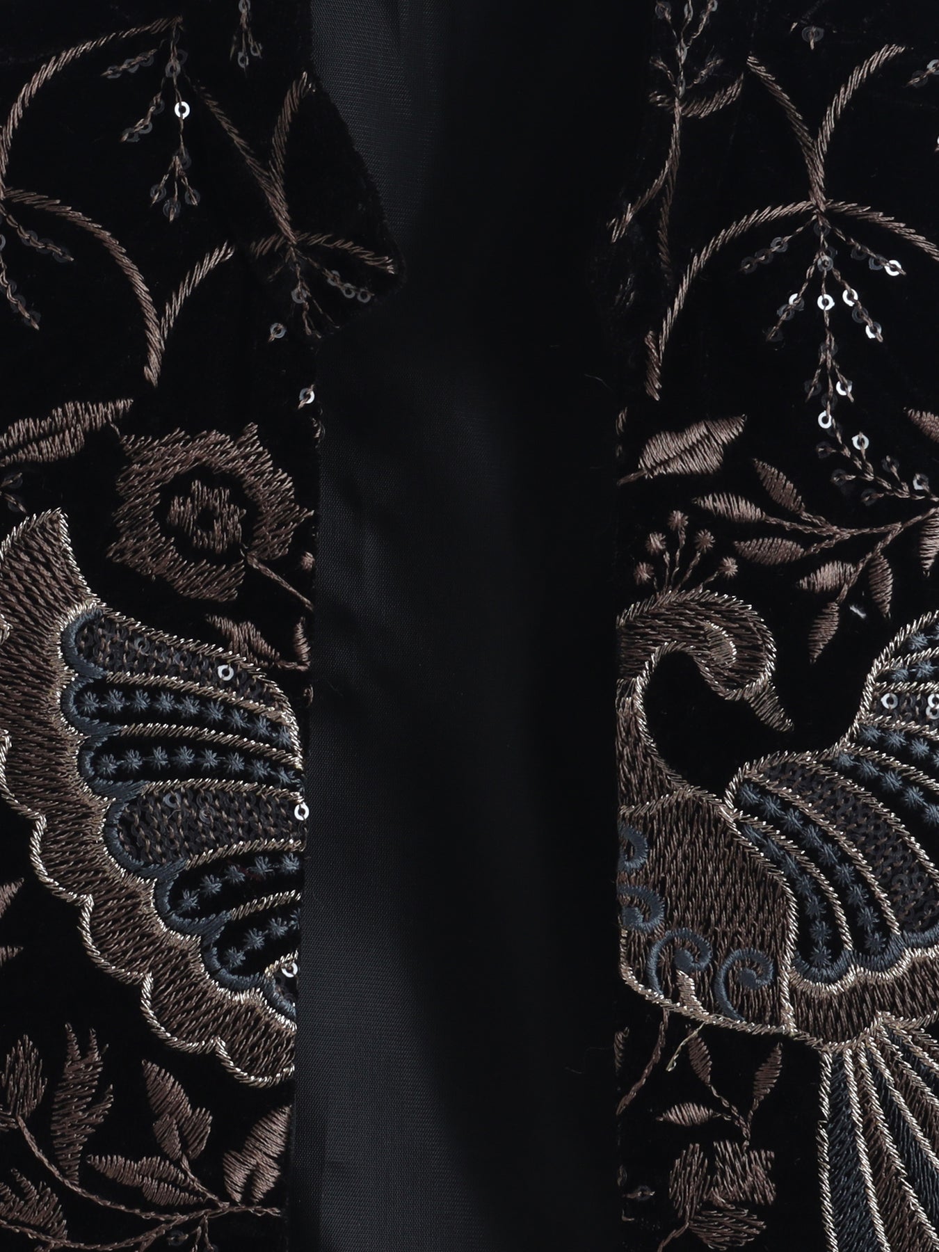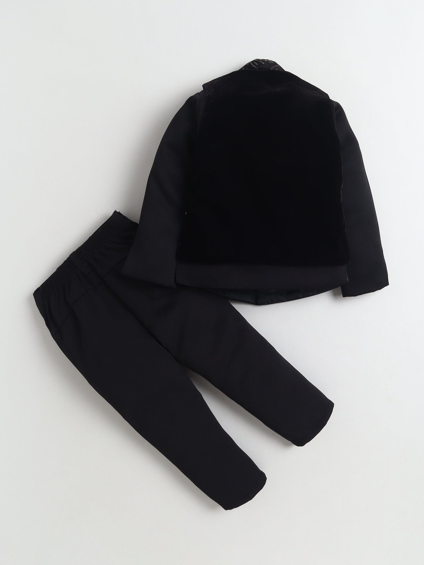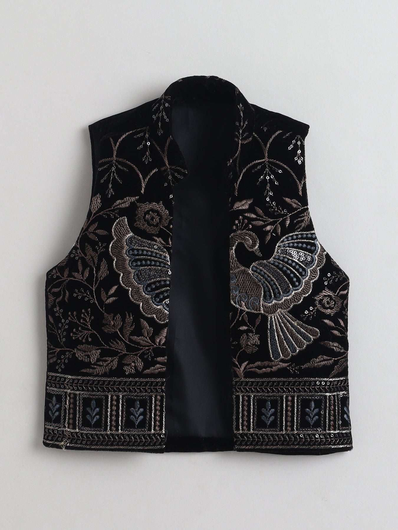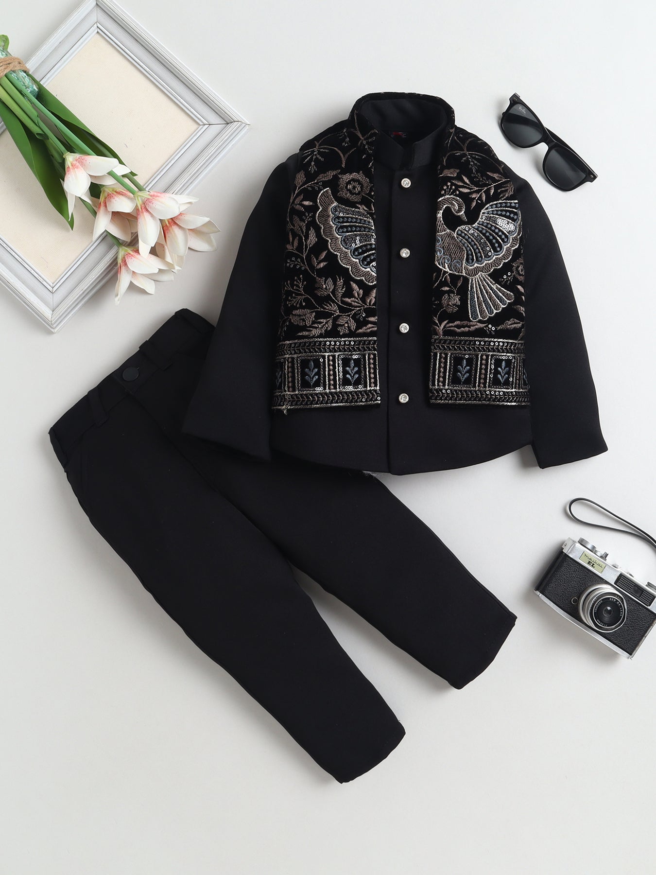 Elevate your little one’s festive wardrobe with this sherwani and trouser set, paired with a luxurious velvet jacket for a regal and standout look. The sherwani features a classic silhouette with a mandarin collar and front button closure, offering a timeless traditional appeal, while the matching trousers ensure comfort and ease of movement throughout the day. The highlight of this ensemble is the rich velvet jacket, adorned with intricate floral vine embroidery, delicate sequin embellishments, and elegant peacock motifs that add a royal and artistic touch. Designed for weddings, festivals, and special occasions, this outfit perfectly blends heritage craftsmanship with modern sophistication, making your child look effortlessly charming and grand.