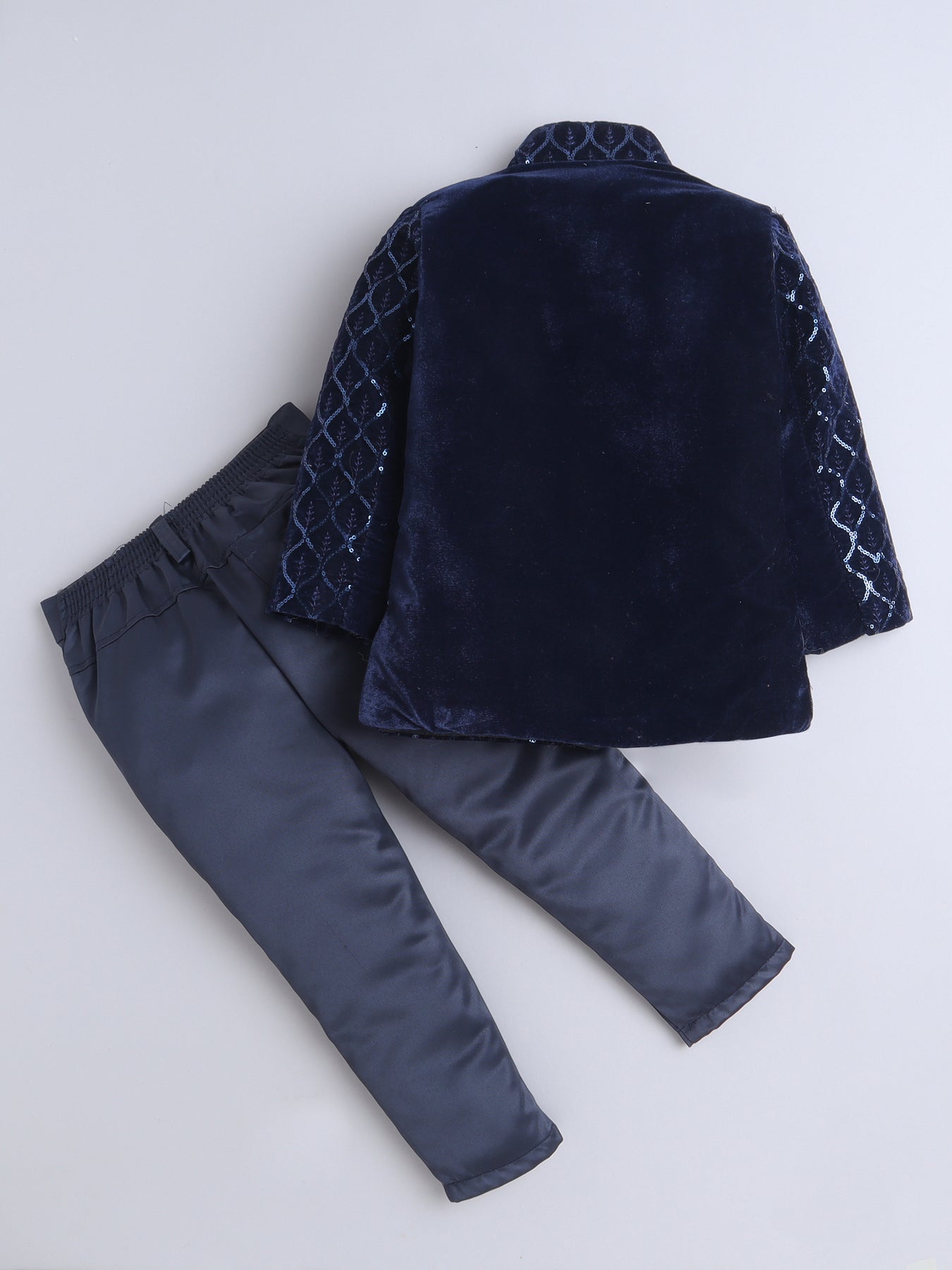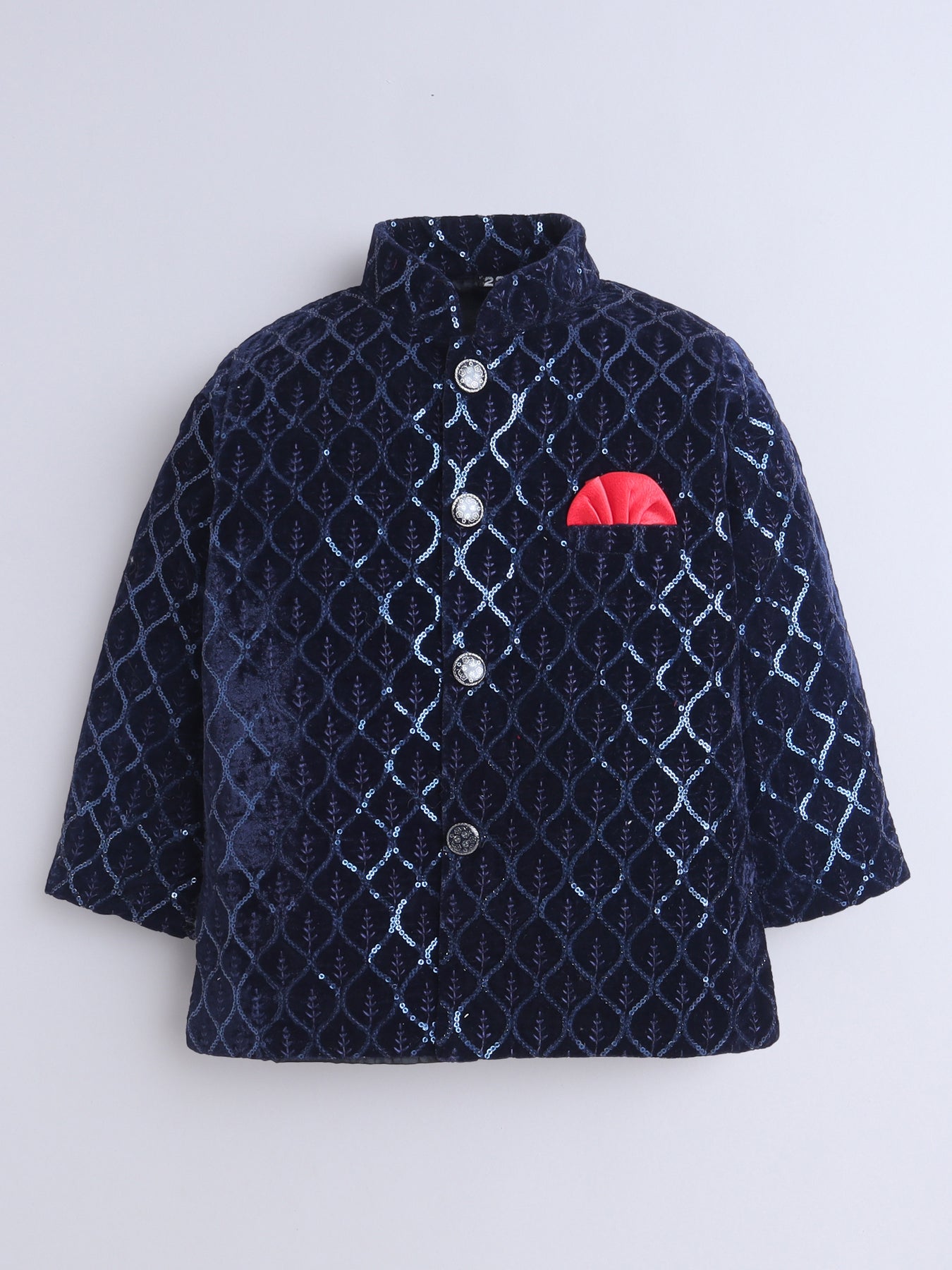 Give your little prince a royal makeover with this Boys Velvet Leaf Motifs Sequined Jodhpuri 2-Piece Suit Set. Designed to make a statement, the set features a richly detailed velvet Jodhpuri blazer adorned with elegant leaf motifs and subtle sequin embellishments. Paired with perfectly tailored trousers, this outfit blends regal tradition with modern flair. The Jodhpuri-style blazer showcases a bandhgala neckline, front button closure, and intricate embroidery that adds charm and grace. Made from soft-touch velvet, it offers a luxurious feel and a polished look—perfect for weddings, festive occasions, and cultural celebrations.